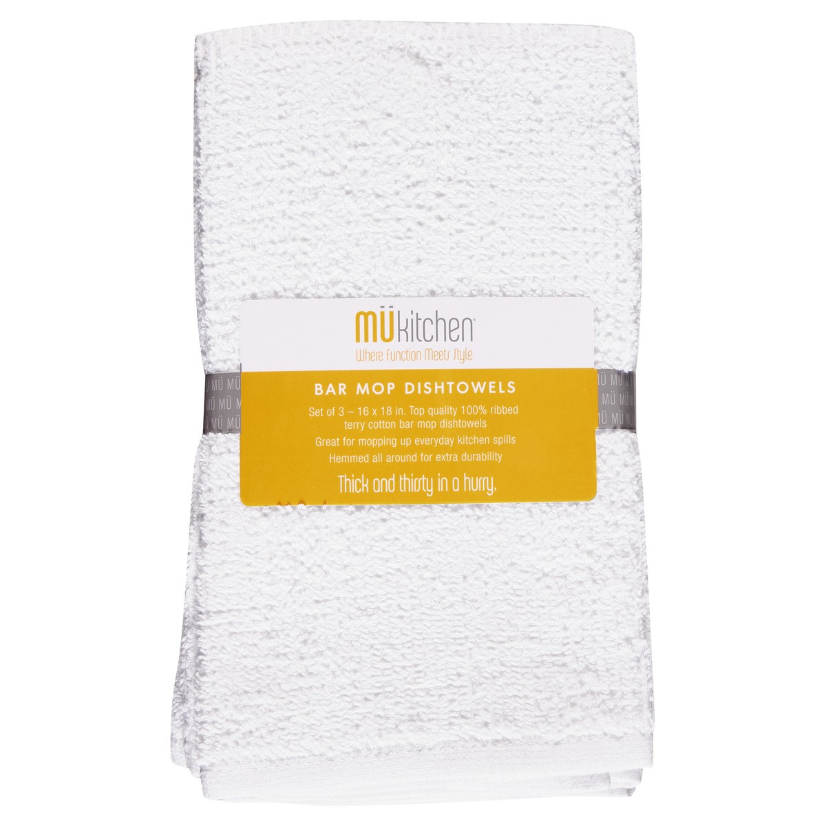 Set of 3 - 16 x 18 in. top quality 100% ribbed terry cotton bar mop dishtowels. Where function meets style. Great for mopping up everyday kitchen spills hemmed all around for extra durability. Thick a…