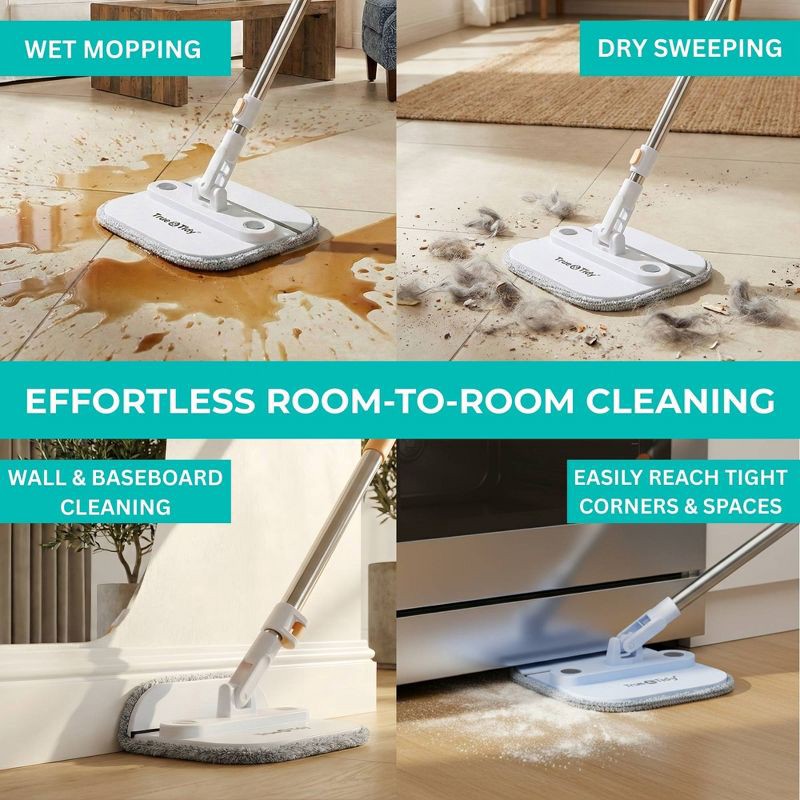 - Total Room Coverage: The 360° swivel square mop head flips up to tackle baseboards, deep corners, and those ""impossible"" tight spaces.