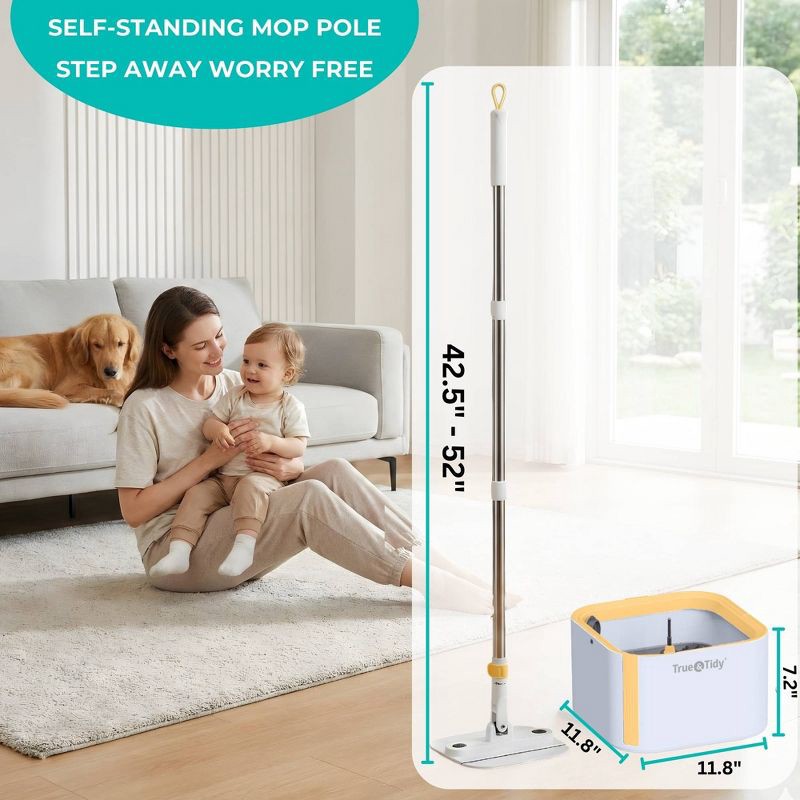 True & Tidy True Clean Dual Bucket 2.0 Spin Mop with Silicone Sweeper: Stainless Steel, Aluminum, Microfiber Materials