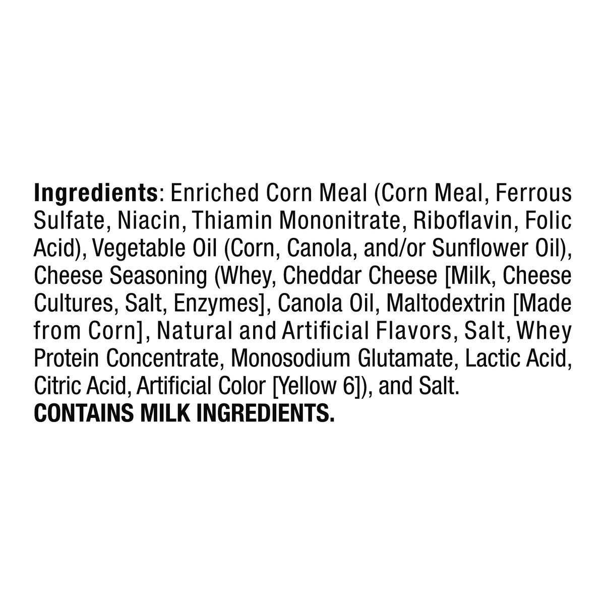 Enriched Corn Meal (Corn Meal, Ferrous Sulfate, Niacin, Thiamin Mononitrate, Riboflavin, Folic Acid), Vegetable Oil (Corn, Canola, and/or Sunflower Oil), Cheese Seasoning (Whey, Cheddar Cheese [Milk, …