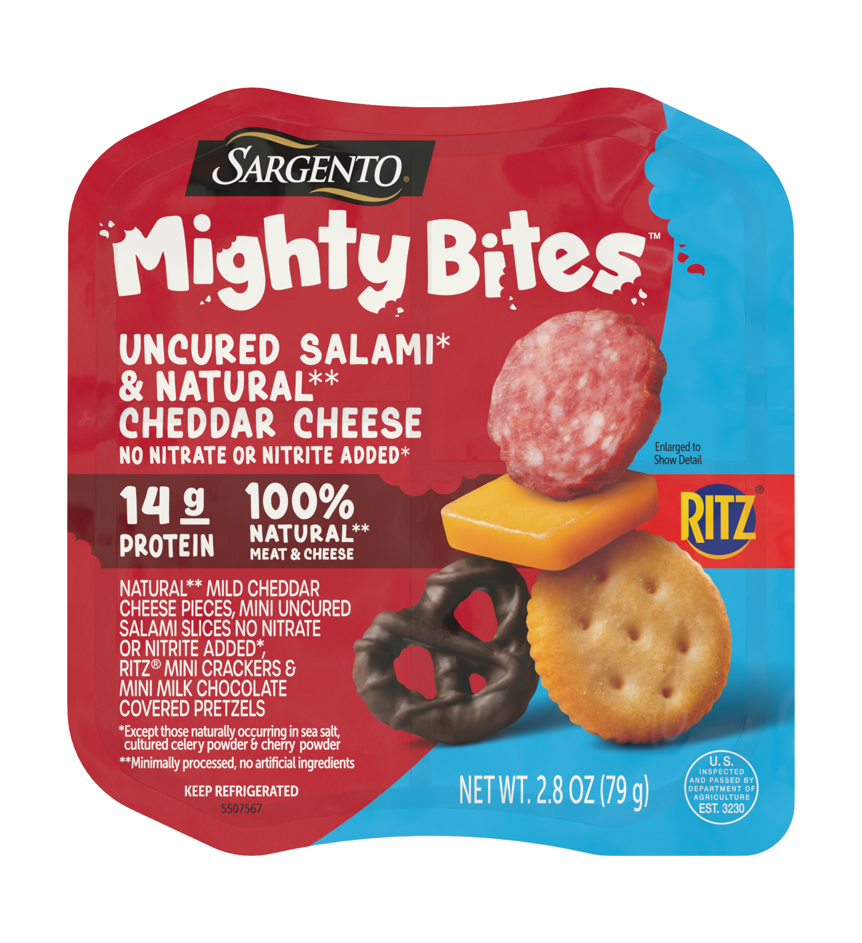 - Lunch time just got an upgrade! Meet your new lunch box favorite— a convenient, high-quality delicious natural** meat and cheese snack kit with 14 grams of protein that both kids and adults will enjoy.With mini uncured salami with no nitrate or nitrite added*, Sargento Natural** Mild Cheddar Cheese, RITZ Mini crackers, and milk chocolate covered pretzels, Sargento Mighty Bites™ are fun to stack, build, & eat! A one-bite treat with less mess—something parents are sure to appreciate. *Except for those naturally occurring in Sea Salt, Cultured Celery Powder & Cherry Powder.With 100% natural** minimally processed meat and cheese without artificial ingredients, RITZ Mini Crackers, and milk chocolate covered pretzels, Sargento Mighty Bites™ offers flavor combinations kids will love in a convenient, cool meat & cheese snack pack.Great for busy families, these tasty snack kits are great to throw in your lunch box, backpack, or purse for a quick little snack or a meal add on.Best enjoyed on its own or paired with veggies, fruit, & a drink or as a lunch box snack. Enjoy as an appetizer, mini charcuterie board, bite sized party tray, or an epic road trip snack!Love our Salami & Mild Cheddar Sargento Mighty Bites™? Try our other varieties today! From Pepperoni & Mozzarella, Honey Ham & Colby-Jack, Turkey & Monterey Jack, and Salami & Pepper Jack there is a Sargento Mighty Bites™ for everyone.