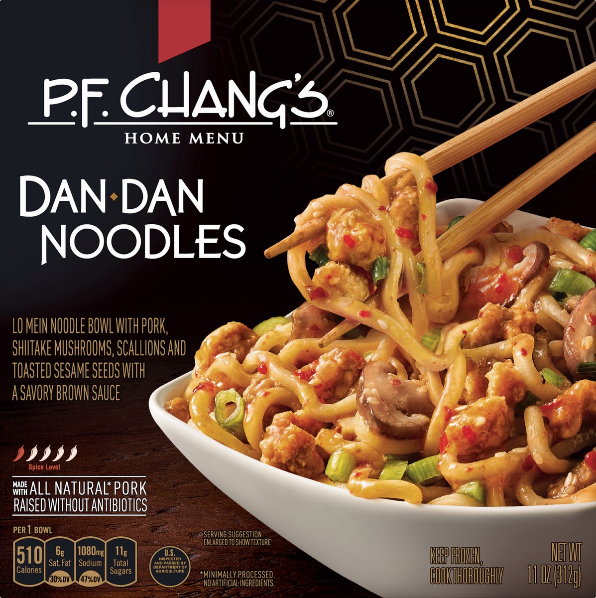 Lo Mein noodle bowl with pork shiitake mushrooms, scallions and toasted sesame seeds with a savory brown sauce. Per 1 Bowl: 510 calories; 6 g sat fat (30% DV); 1080 mg sodium (47% DV); 11 g total suga…
