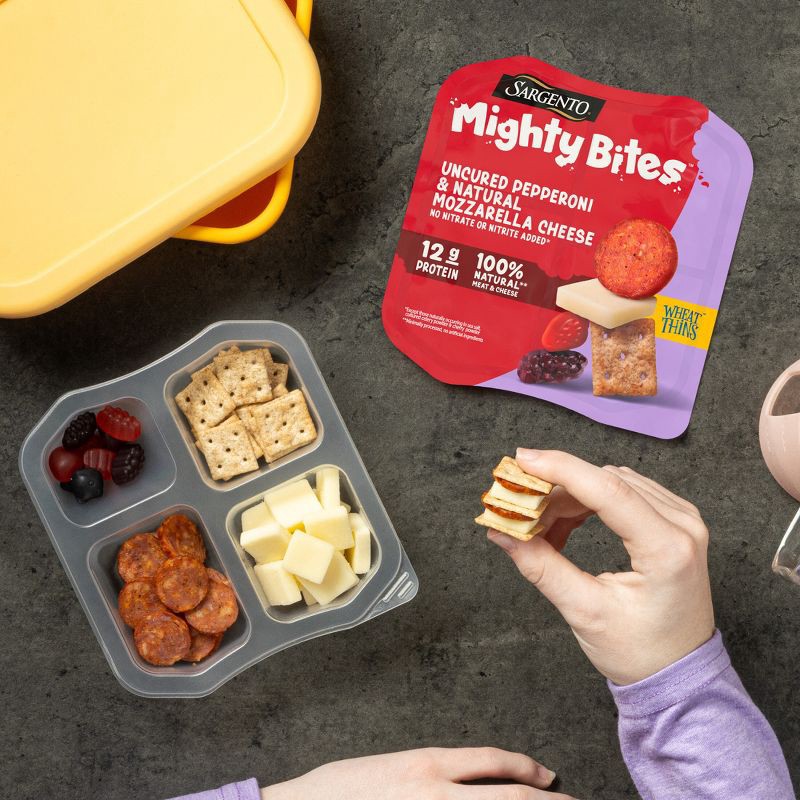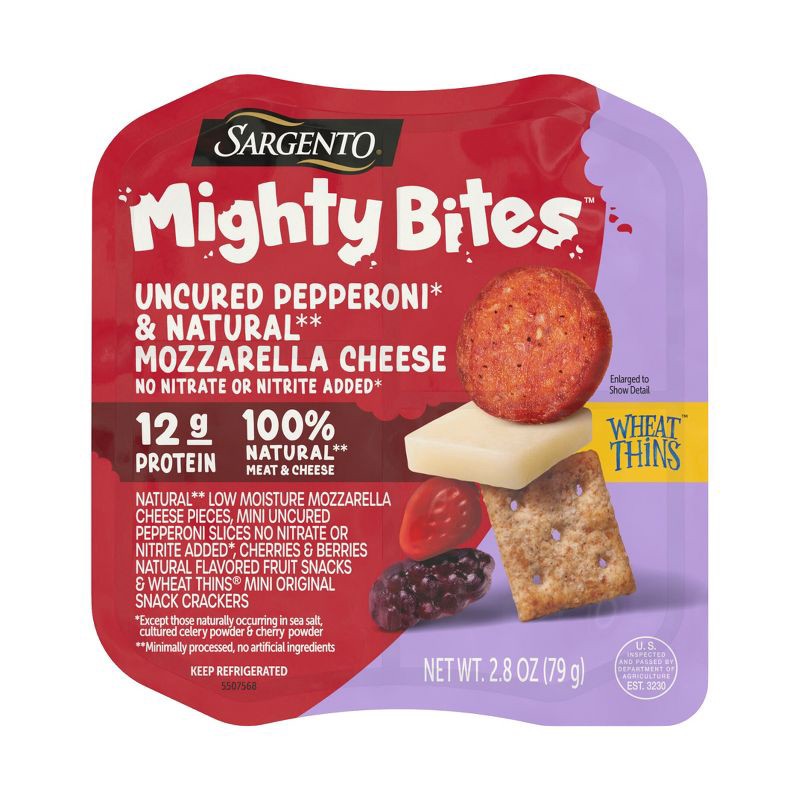 - With mini uncured pepperoni with no nitrate or nitrite added*, Sargento® Natural** Mozzarella Cheese, Wheat Thins® Mini original crackers, and cherries & berries natural flavored fruit snacks, Sargento Mighty Bites™ are fun to stack, build, & eat! A one-bite treat with less mess—something parents are sure to appreciate. *Except for those naturally occurring in Sea Salt, Cultured Celery Powder & Cherry Powder