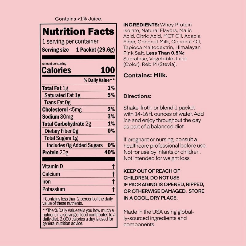 Whey Protein Isolate, Natural Flavors, Malic Acid, Citric Acid, MCT Oil, Acacia Fiber, Coconut Milk, Himalayan Pink Salt, Coconut Oil, Tapioca Maltodextrin, Less Than 0.5%: Sucralose, Vegetable Juice …