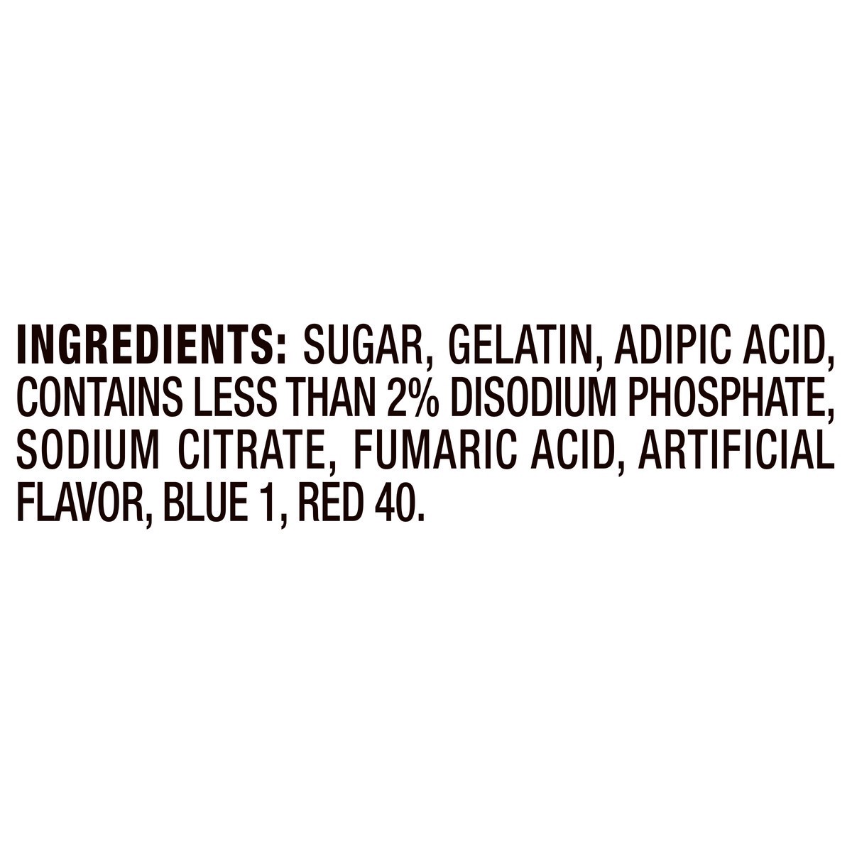 SUGAR, GELATIN, ADIPIC ACID, CONTAINS LESS THAN 2% OF SODIUM PHOSPHATE, SODIUM CITRATE, FUMARIC ACID, RED 40, ARTIFICIAL FLAVOR, BLUE 1.