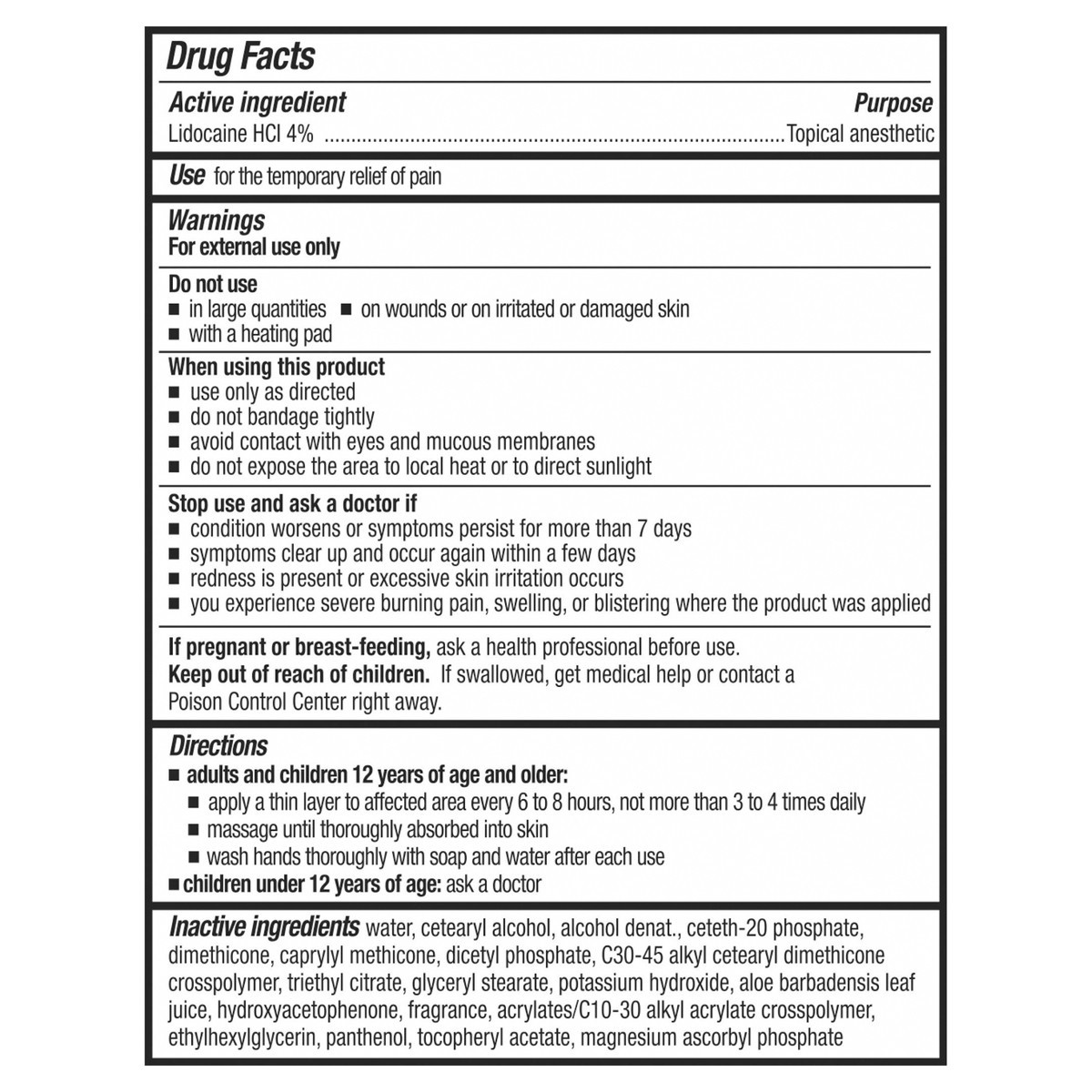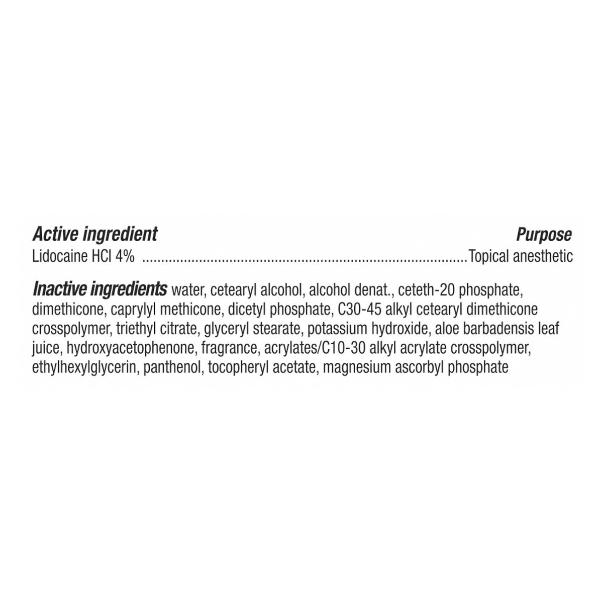 Active Ingredients: Lidocaine HCI (4 %), Topical Anesthetic. Inactive Ingredients: Water, Cetearyl Alcohol, Alcohol Denat., Ceteth-20 Phosphate, Dimethicone, Caprylyl Methicone, Dicetyl Phosphate, C30…