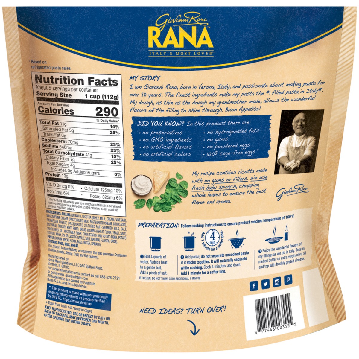 Giovanni Rana's spinach and cheese tortellini is made with baby spinach and a blend of ricotta and Parmesan cheeses wrapped in a thin dough. Using high quality ingredients and no preservatives, no pow…