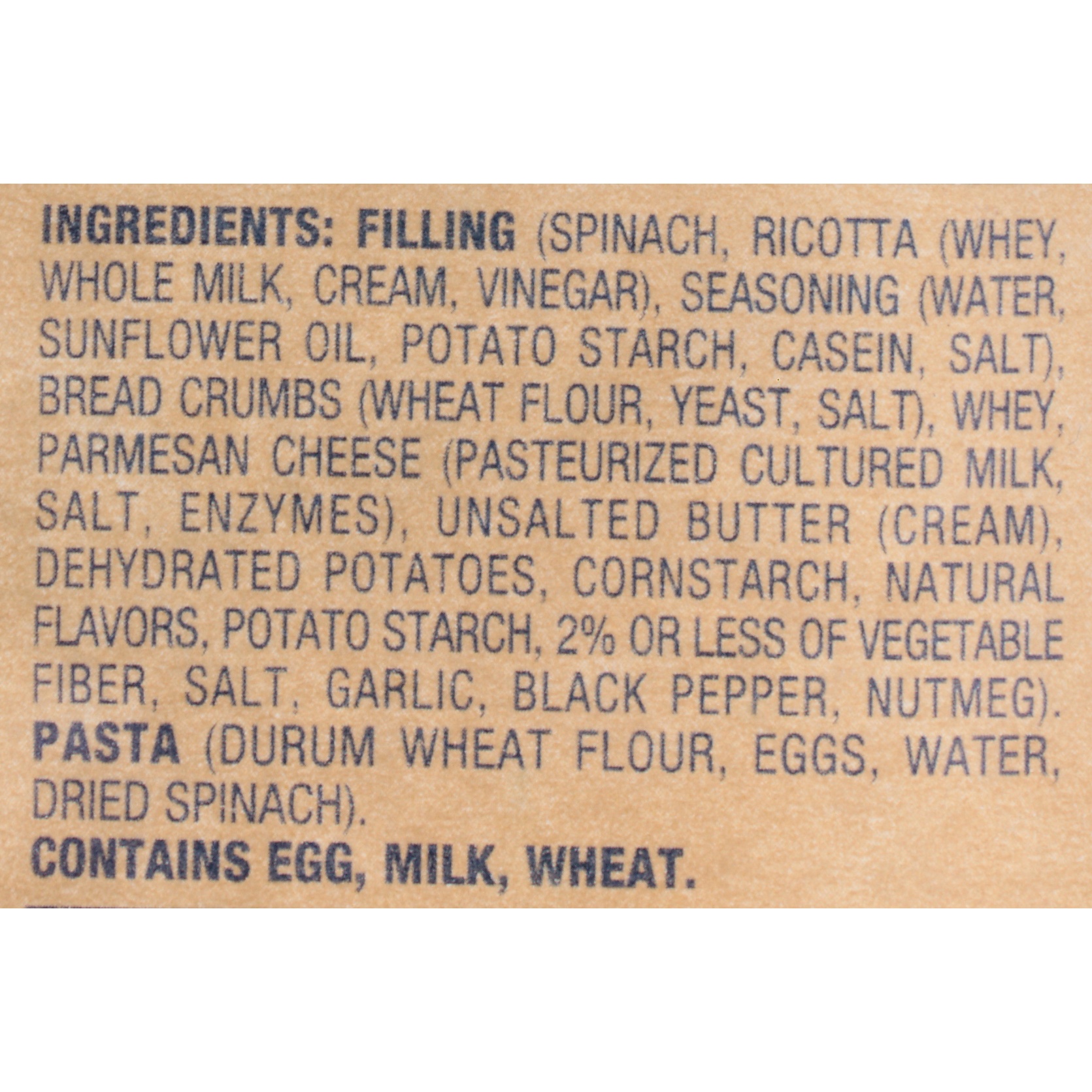 FILLING: SPINACH, RICOTTA CHEESE (WHEY, MILK, CREAM, VINEGAR), MASCARPONE CHEESE (PASTEURIZED CREAM, PASTEURIZED MILK), PARMESAN CHEESE (PASTEURIZED CULTURED PART-SKIM MILK, SALT, ENZYMES), WHEY, BREA…