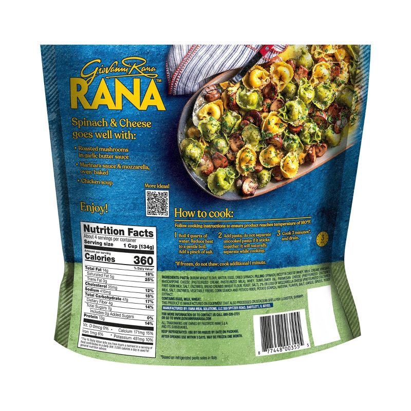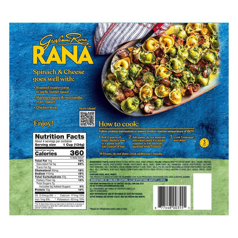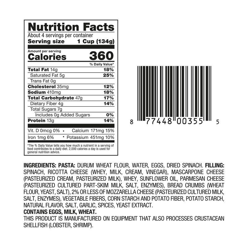 PASTA: DURUM WHEAT FLOUR, WATER, EGGS, DRIED SPINACH. FILLING: SPINACH, RICOTTA CHEESE (WHEY, MILK, CREAM, VINEGAR), MASCARPONE CHEESE (PASTEURIZED CREAM, PASTEURIZED MILK), WHEY, SUNFLOWER OIL, PARME…
