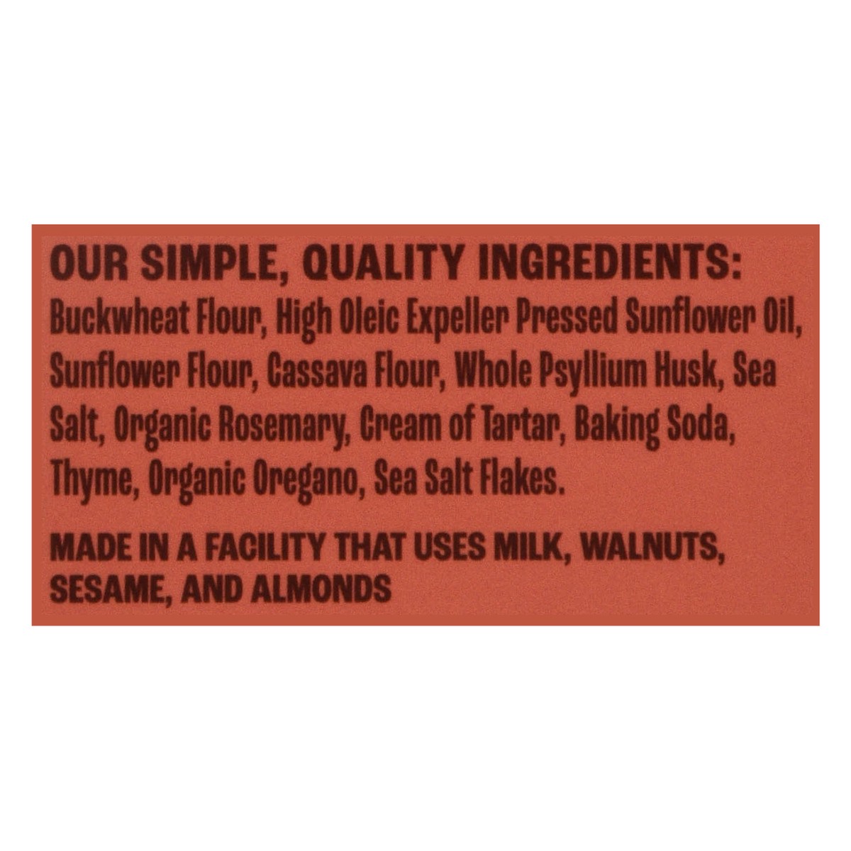 Our Simple, Quality Ingredients: Buckwheat Flour, High Oleic Expeller Pressed Sunflower Oil, Sunflower Flour, Cassava Flour, Whole Psyllium Husk, Sea Salt, Organic Rosemary, Cream of Tartar, Baking So…