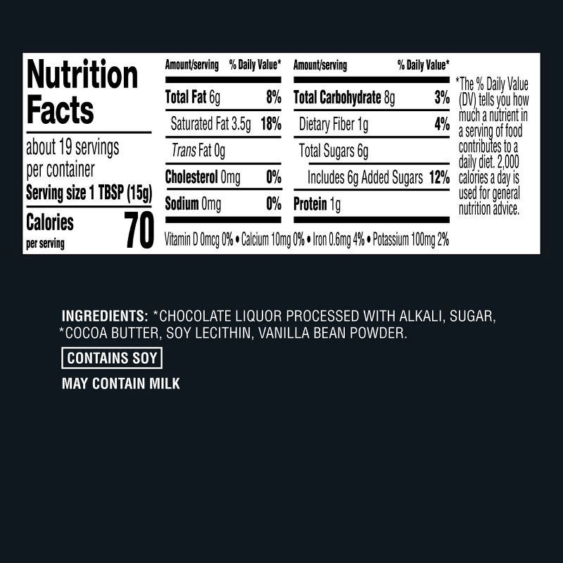 *CHOCOLATE LIQUOR PROCESSED WITH ALKALI, SUGAR, *COCOA BUTTER, SOY LECITHIN, VANILLA BEAN POWDER. *FAIR TRADE USA
