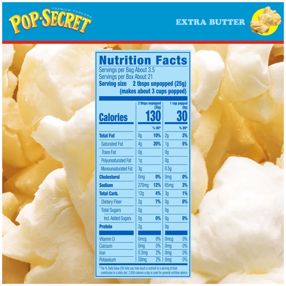 Pop Secret Extra Butter Flavor popcorn is the next level in buttery flavor, and our most buttery-tasting popcorn yet. What''s our secret for the best popcorn? Kernels popped up light and fluffy with d…
