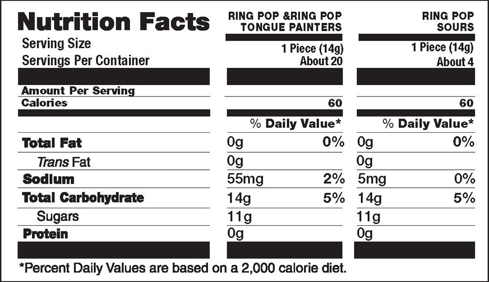Ring Pop: All Flavors Contain: Sugar, Corn Syrup, Lactic Acid. Additionally: Blue Raspberry: Artificial Flavor, Blue 1. Strawberry: Natural & Artificial Flavors, Red 3, Blue 1. Watermelon: Artificial …