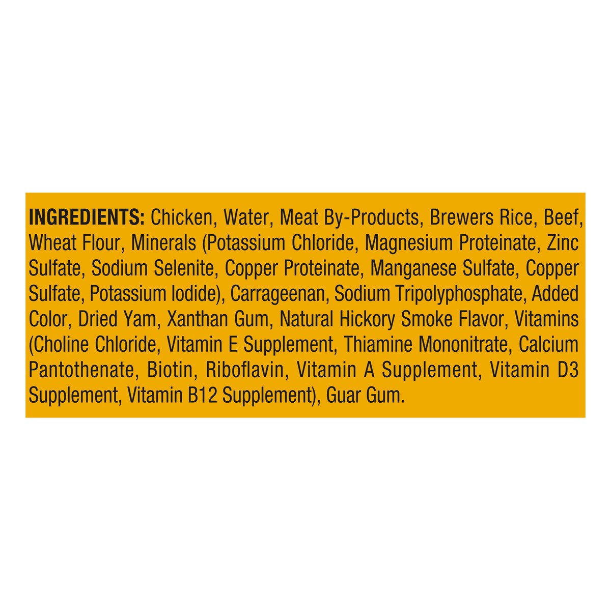 Chicken, Water, Meat By-Products, Brewers Rice, Beef, Wheat Flour, Minerals (Potassium Chloride, Magnesium Proteinate, Zinc Sulfate, Sodium Selenite, Copper Proteinate, Manganese Sulfate, Copper Sulfa…