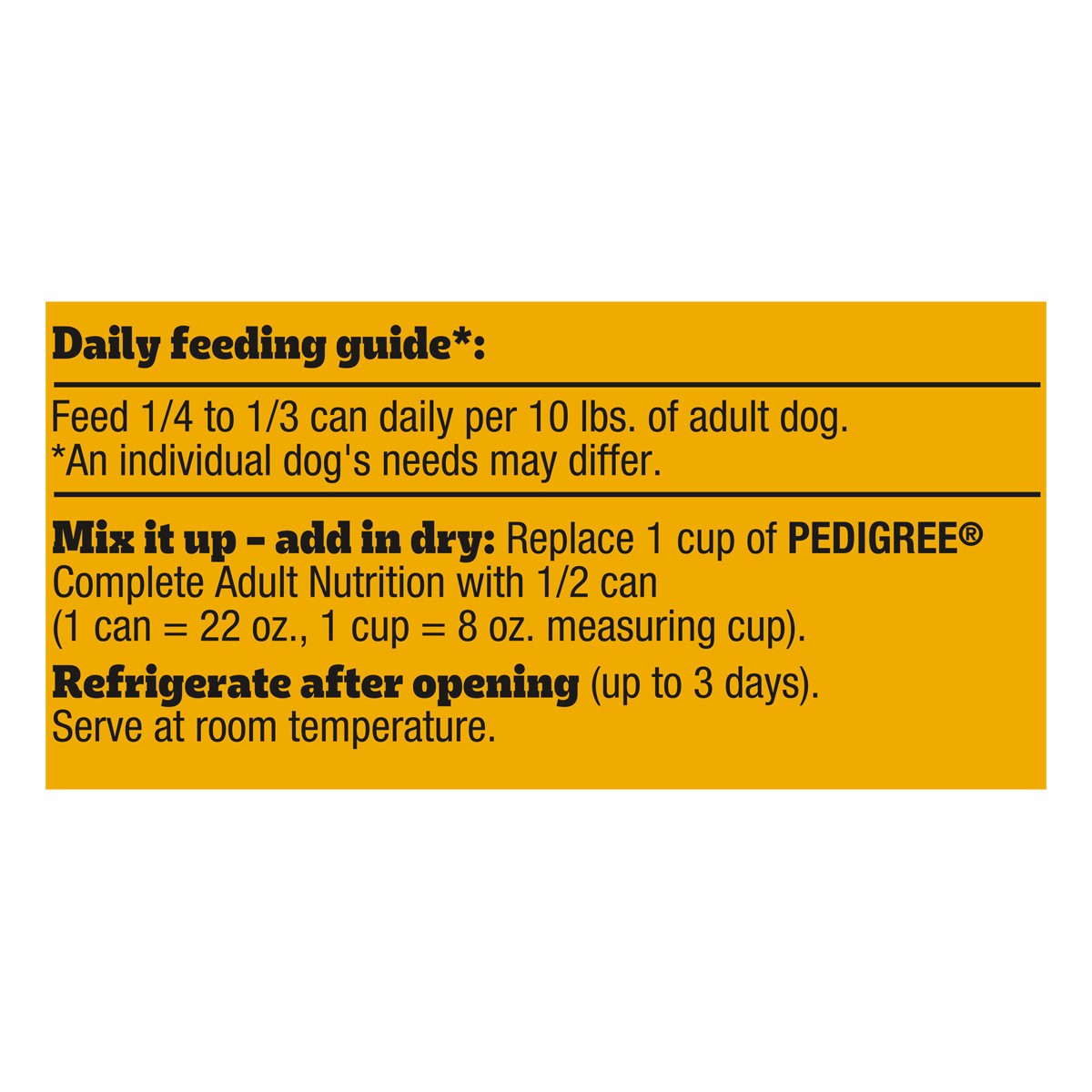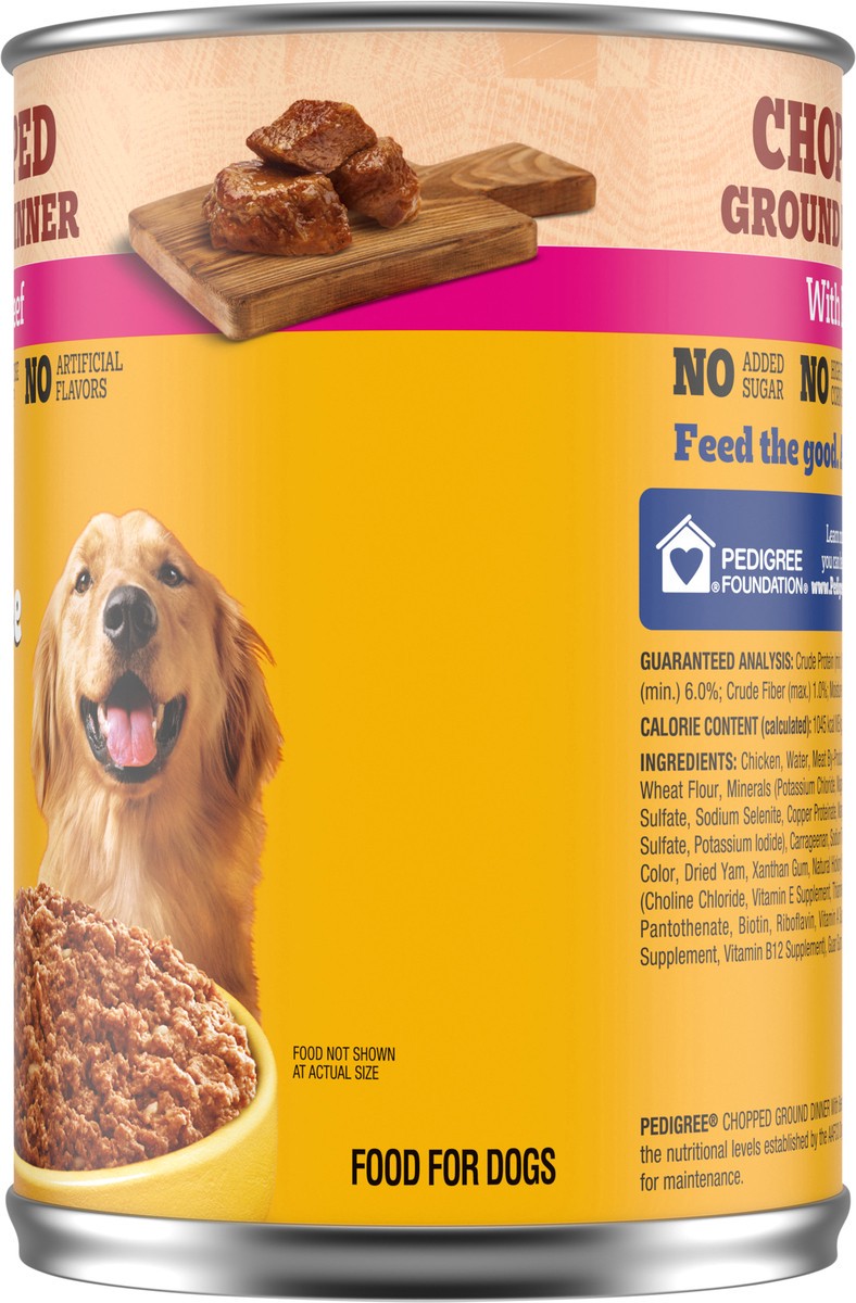 Calorie Content (Calculated): 1045 kcal ME/kg, 653 kcal ME/Can. Pedigree Chopped Ground Dinner with beef is formulated to meet the nutritional levels established by the AAFCO dog food nutrient profile…