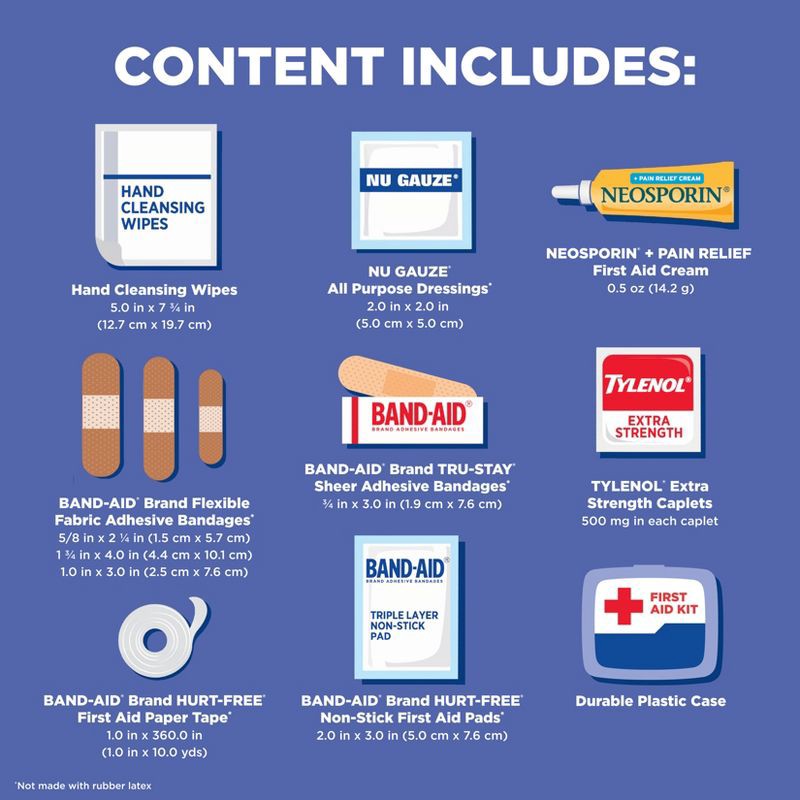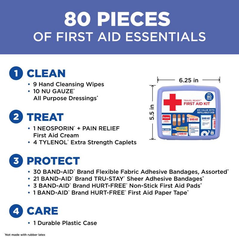 - BAND-AID Brand Travel Ready First Aid Kit with 80 wound care supplies for on-the-go first aid