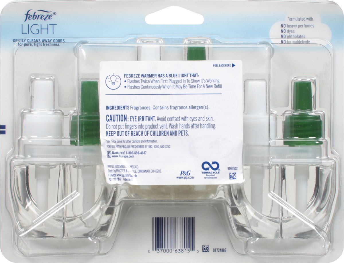 No heavy perfumes. Scratch & sniff. Febreeze warmer has a blue light that: Flashes twice when first plugged in to show it's working. Flashes continuously when it may be time for a new refill. Formulat…