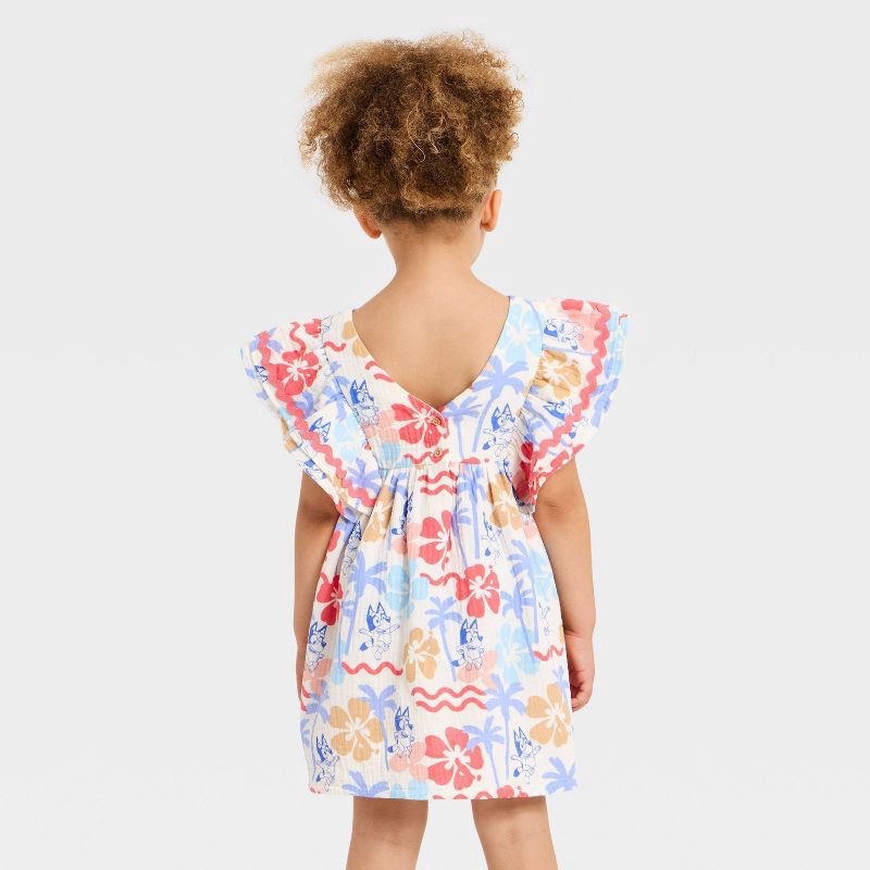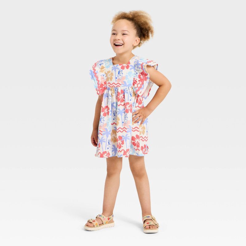 Get your little Bluey fan ready for summer days in this Bluey Gauze Dress. Made from cotton-blend gauze fabric for a cozy feel, this dress features allover summery tropical print in vibrant colors plu…