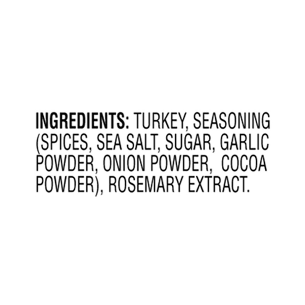 Ingredients: Turkey, Seasoning (Spices, Sea Salt, Sugar, Garlic Powder, Onion Powder, Cocoa Powder), Rosemary Extract.