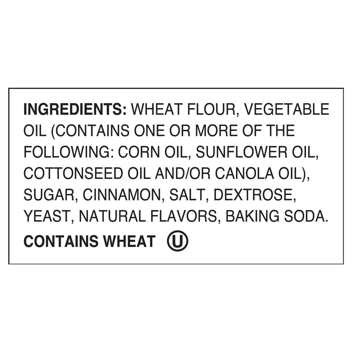 Wheat Flour, Vegetable Oil (Contains One or More of the Following: Corn Oil, Sunflower Oil, Cottonseed Oil and/or Canola Oil), Sugar, Cinnamon, Salt, Dextrose, Yeast, Natural Flavors, Baking Soda.