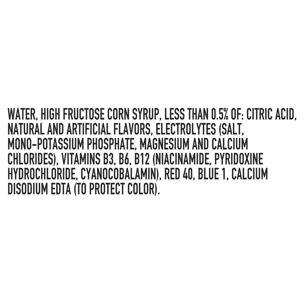 WATER, HIGH FRUCTOSE CORN SYRUP, LESS THAN 0.5% OF: CITRIC ACID, NATURAL AND ARTIFICIAL FLAVORS, ELECTROLYTES (SALT, MONO-POTASSIUM PHOSPHATE, MAGNESIUM AND CALCIUM CHLORIDES), VITAMINS B3, B6, B12 (N…