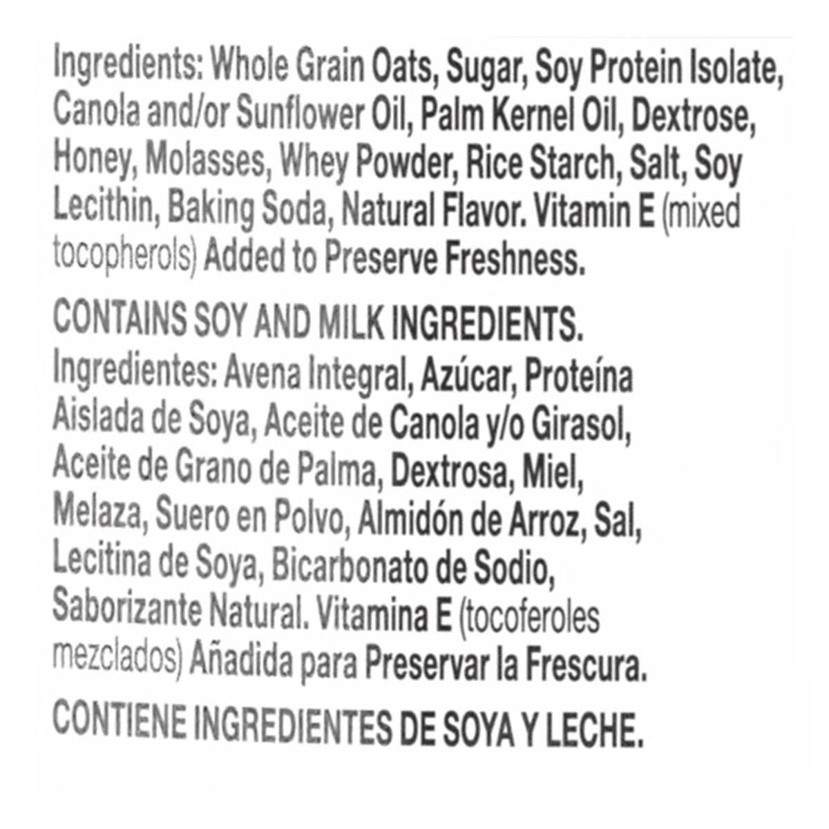 Whole Grain Oats, Sugar, Soy Protein Isolate, Canola and/or Sunflower Oil, Palm Kernel Oil, Dextrose, Honey, Molasses, Whey Powder, Rice Starch, Salt, Soy Lecithin, Baking Soda, Natural Flavor, Vitamiā¦