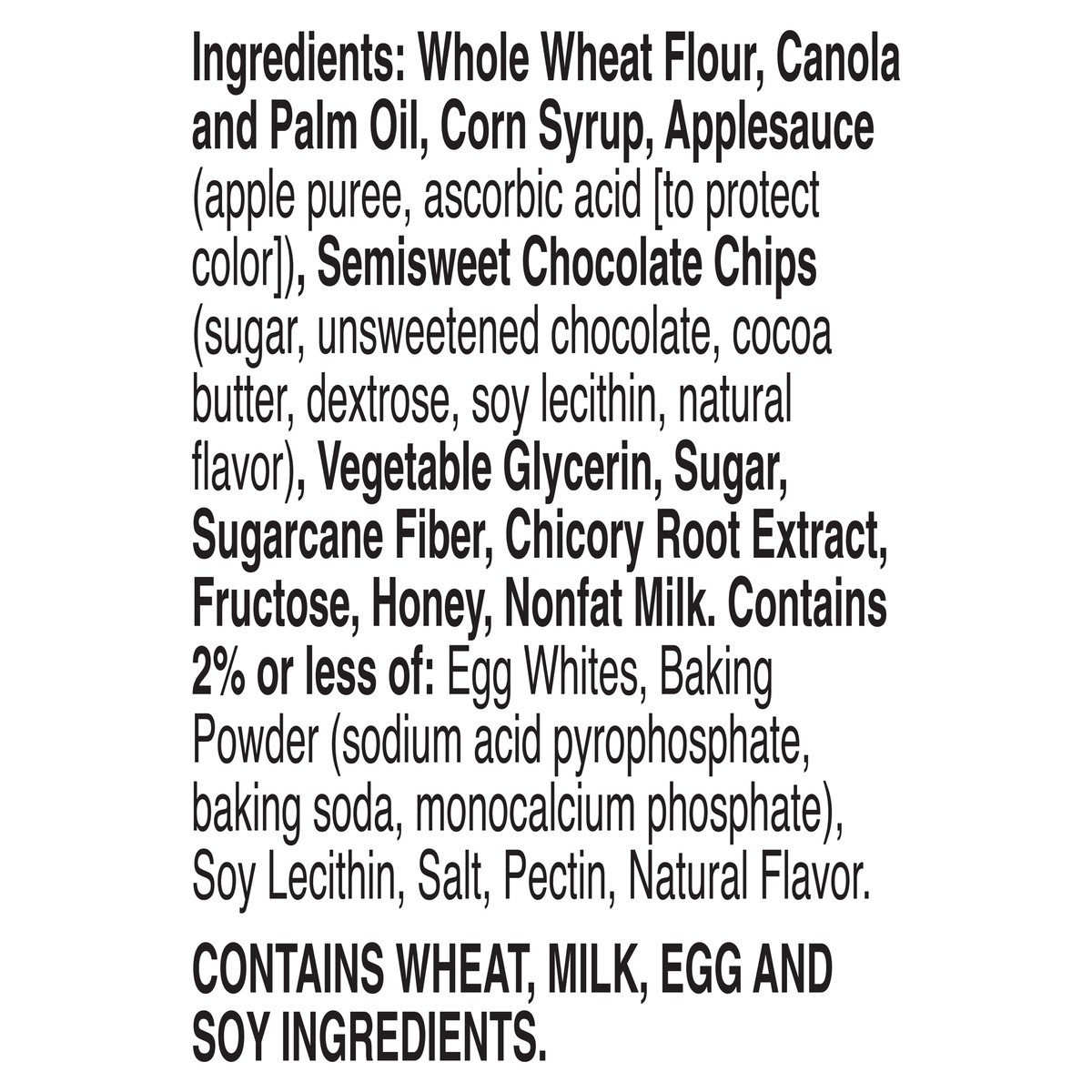 Whole Wheat Flour, Canola and Palm Oil, Corn Syrup, Applesauce (Apple Puree, Ascorbic Acid [to Protect Color]), Semisweet Chocolate Chips (Sugar, Unsweetened Chocolate, Cocoa Butter, Dextrose, Soy Lec…