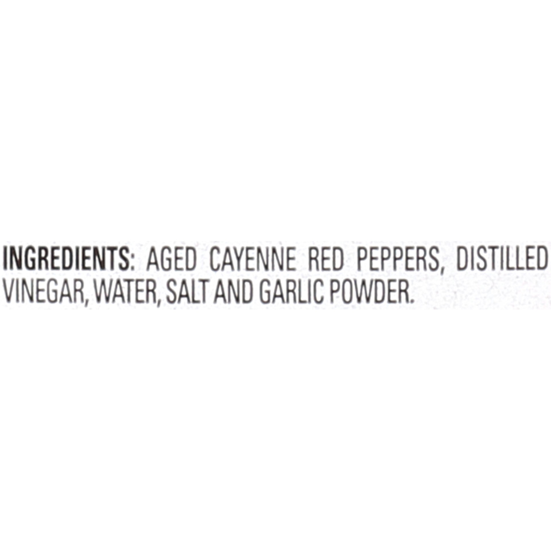 Aged Cayenne Red Peppers, Vinegar, Water, Salt, and Garlic Powder.