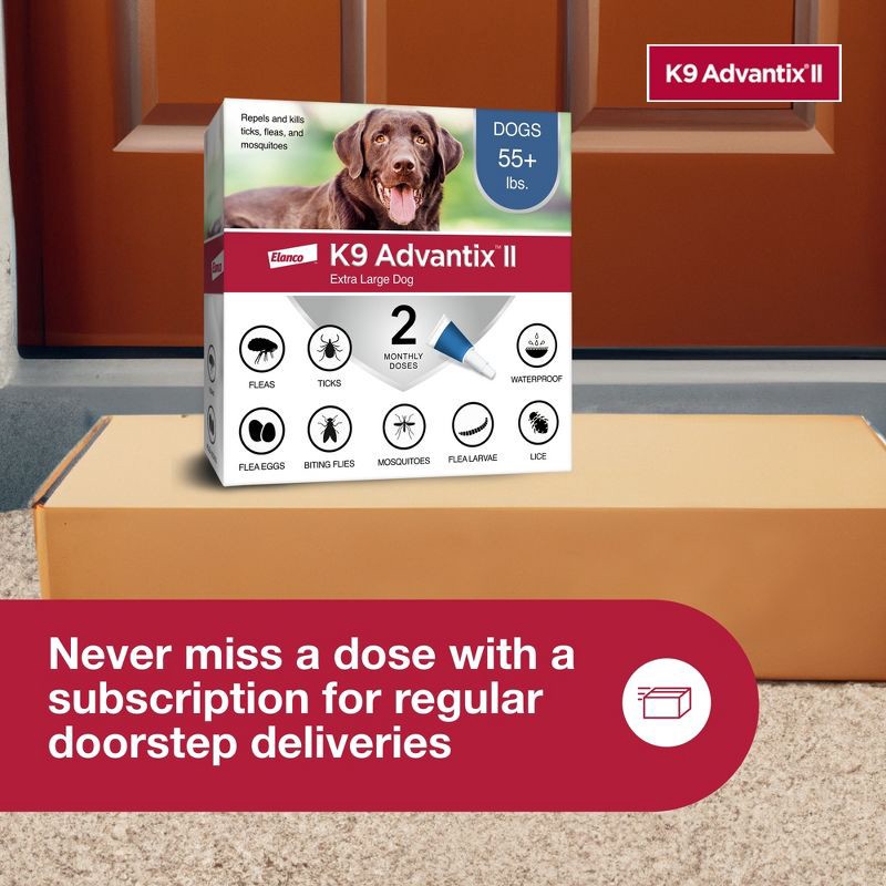 - K9 Advantix II Extra Large Dog 30-day treatment & prevention protects dogs over 55 lbs. from fleas, ticks, mosquitoes, biting flies and lice