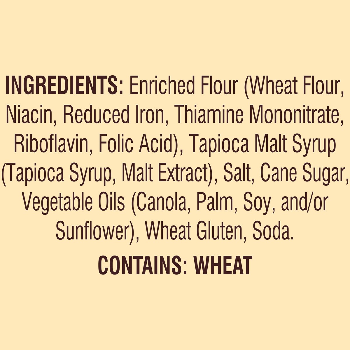 INGREDIENTS: ENRICHED FLOUR (WHEAT FLOUR, NIACIN, REDUCED IRON, THIAMINE MONONITRATE, RIBOFLAVIN, FOLIC ACID), TAPIOCA MALT SYRUP (TAPIOCA SYRUP, MALT EXTRACT), SALT, CANE SUGAR, VEGETABLE OILS (CANOL…