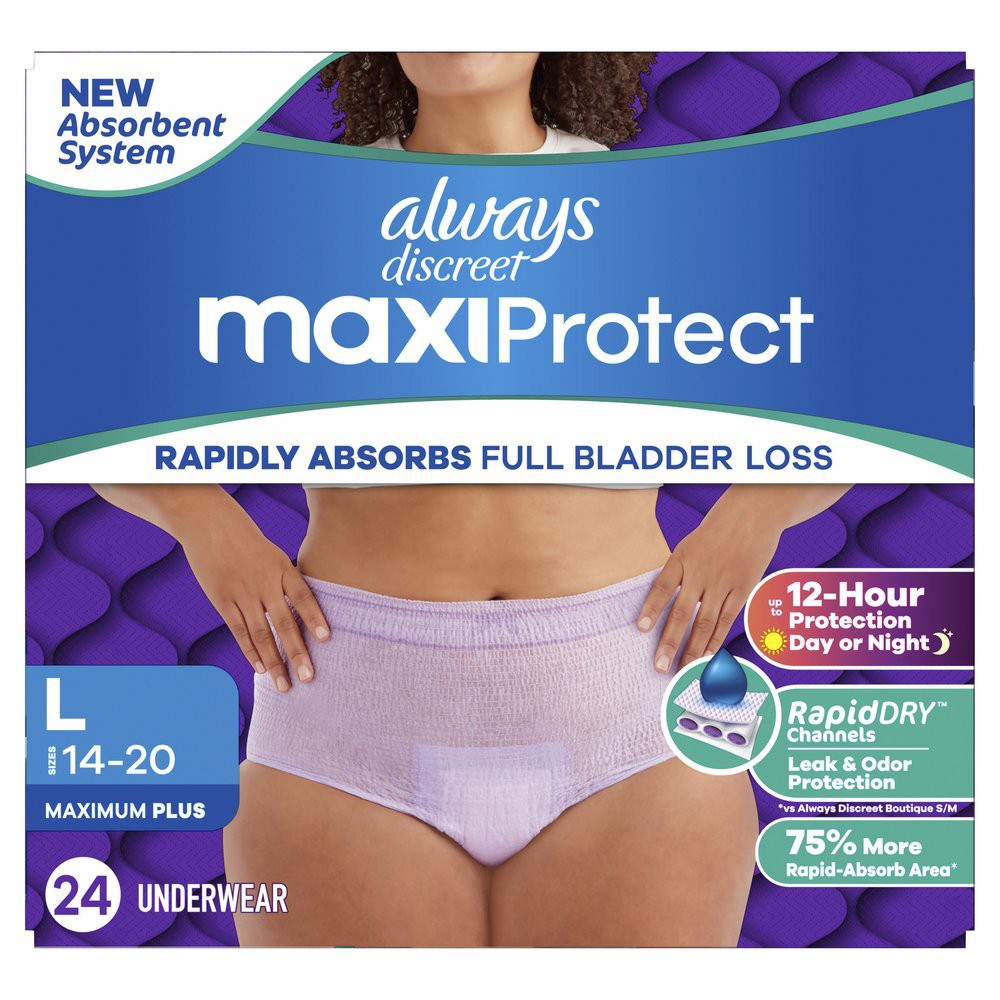 Say hello to Always Discreet MaxiProtect incontinence underwear! These reimagined adult diapers for women rapidly absorb full bladder loss for incontinence protection you can depend on. Designed to fi…
