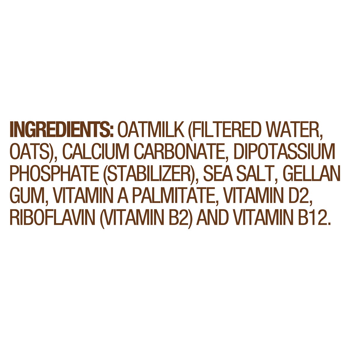 OATMILK (FILTERED WATER, OATS), CALCIUM CARBONATE, DIPOTASSIUM PHOSPHATE (STABILIZER), SEA SALT, GELLAN GUM, VITAMIN A PALMITATE, VITAMIN D2, RIBOFLAVIN (VITAMIN B2) AND VITAMIN B12.