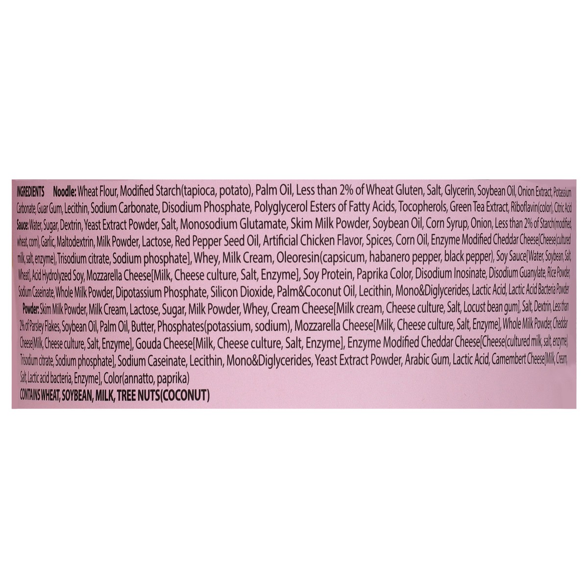 Noodle: Wheat Flour, Modified Starch (Tapioca, Potato), Palm Oil, Less than 2% of Wheat Gluten, Salt, Glycerin, Soybean Oil, Onion Extract, Potassium Carbonate, Guar Gum, Lecithin, Sodium Carbonate, D…