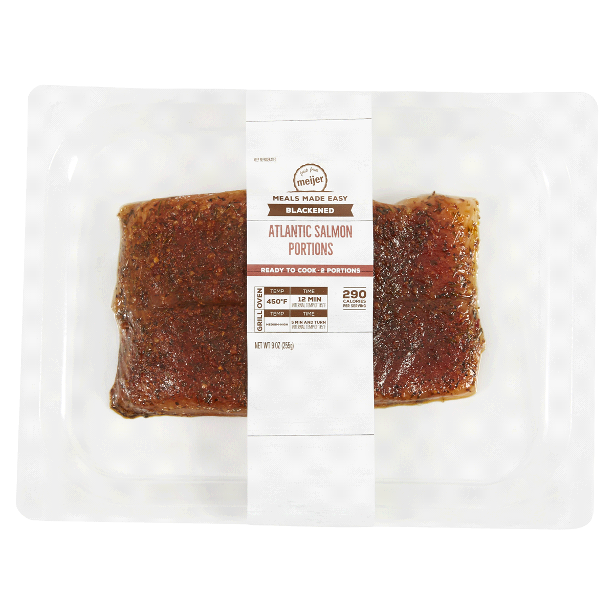 MEIJER. MEALS MADE EASY. BLACKENED. ATLANTIC SALMON PORTIONS. READY TO COOK. 2 PORTIONS. 290 CALORIES PER SERVING. 9OZ