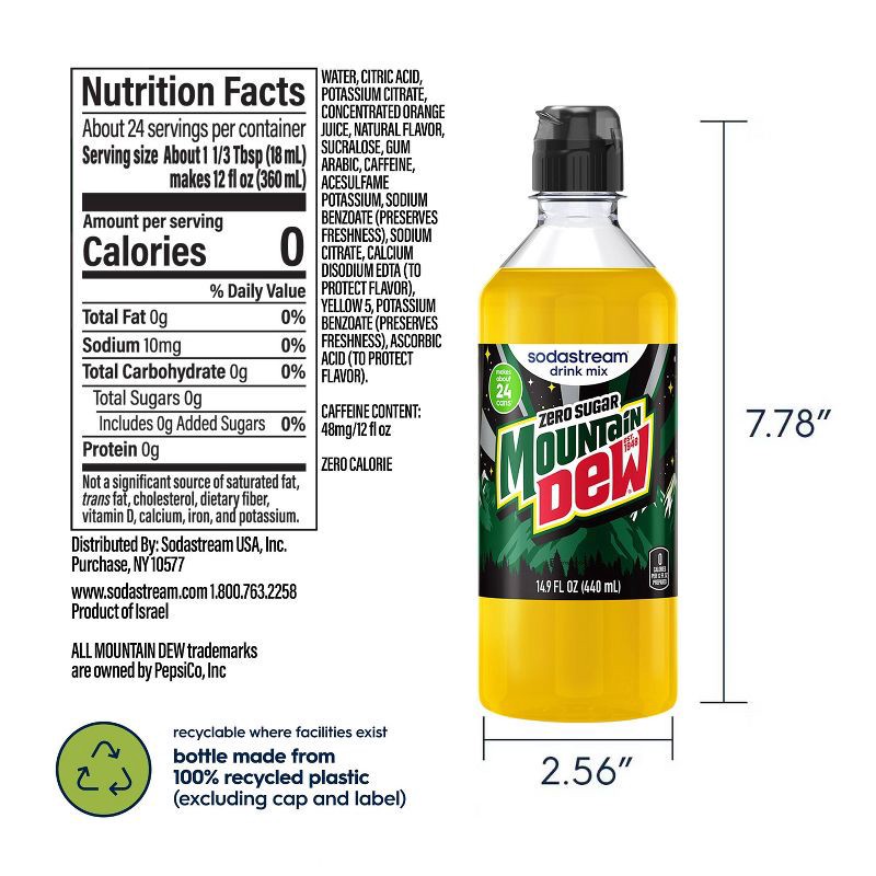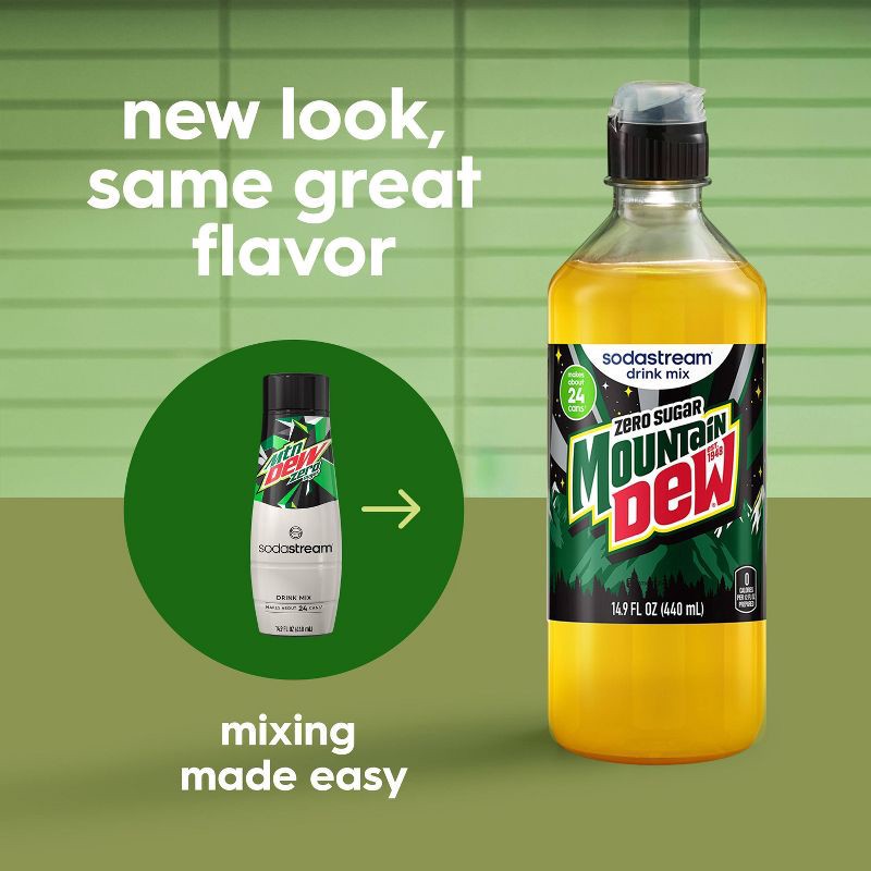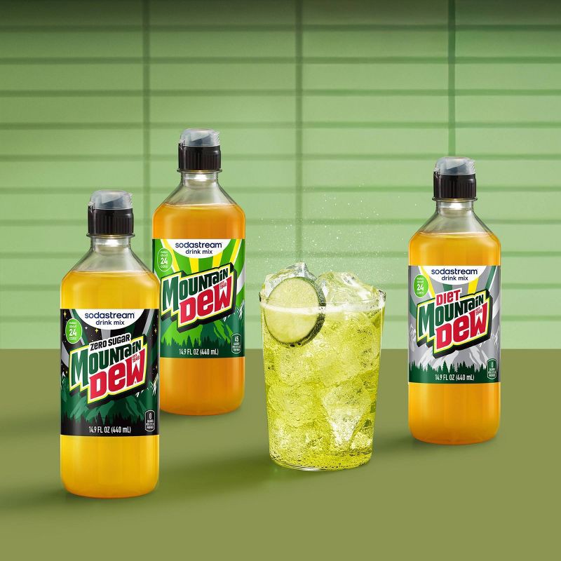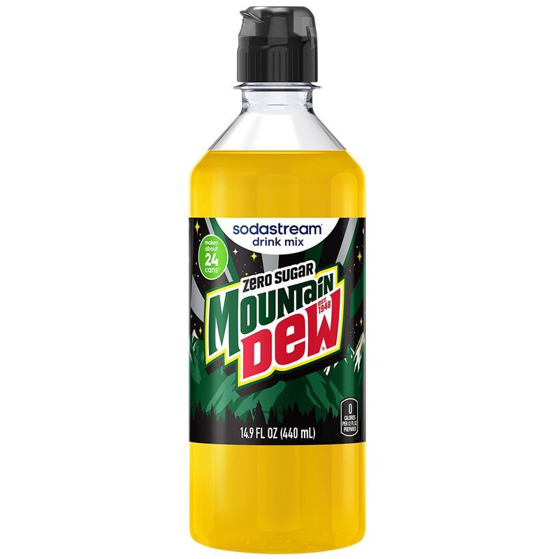 - Includes: (1) 440ml SodaStream® Mountain Dew® Zero Sugar Drink Mix bottles