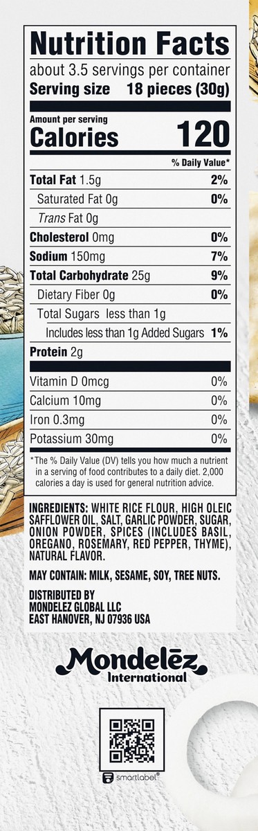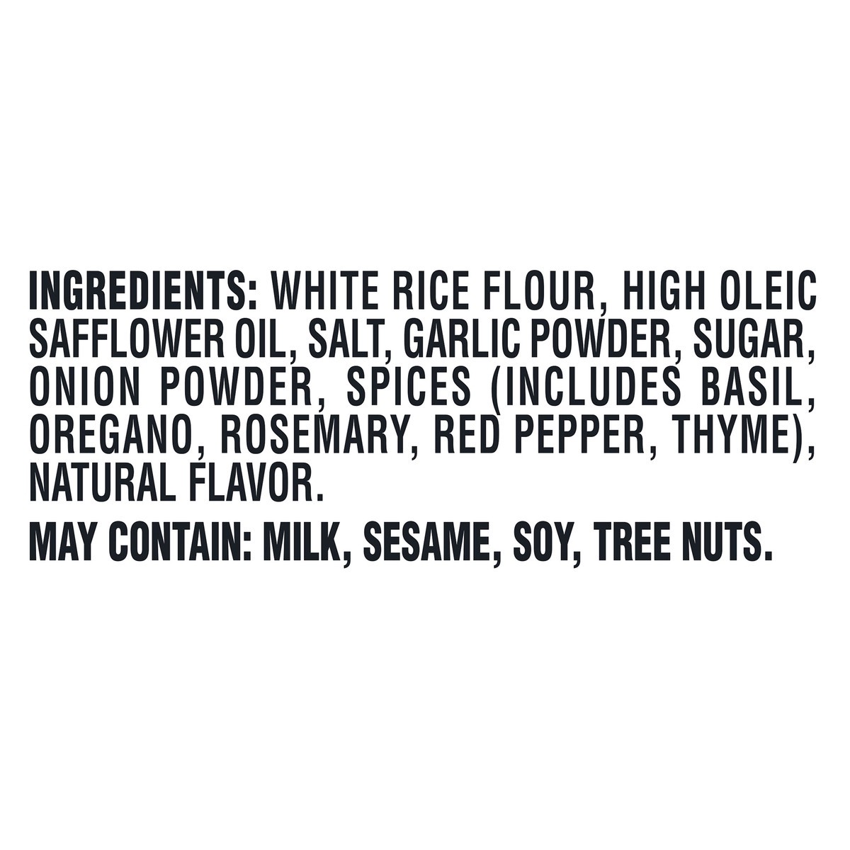White Rice Flour, High Oleic Safflower Oil, Salt, Garlic Powder, Sugar, Onion Powder, Spices (Includes Basil, Oregano, Rosemary, Red Pepper, Thyme), Natural Flavor.
