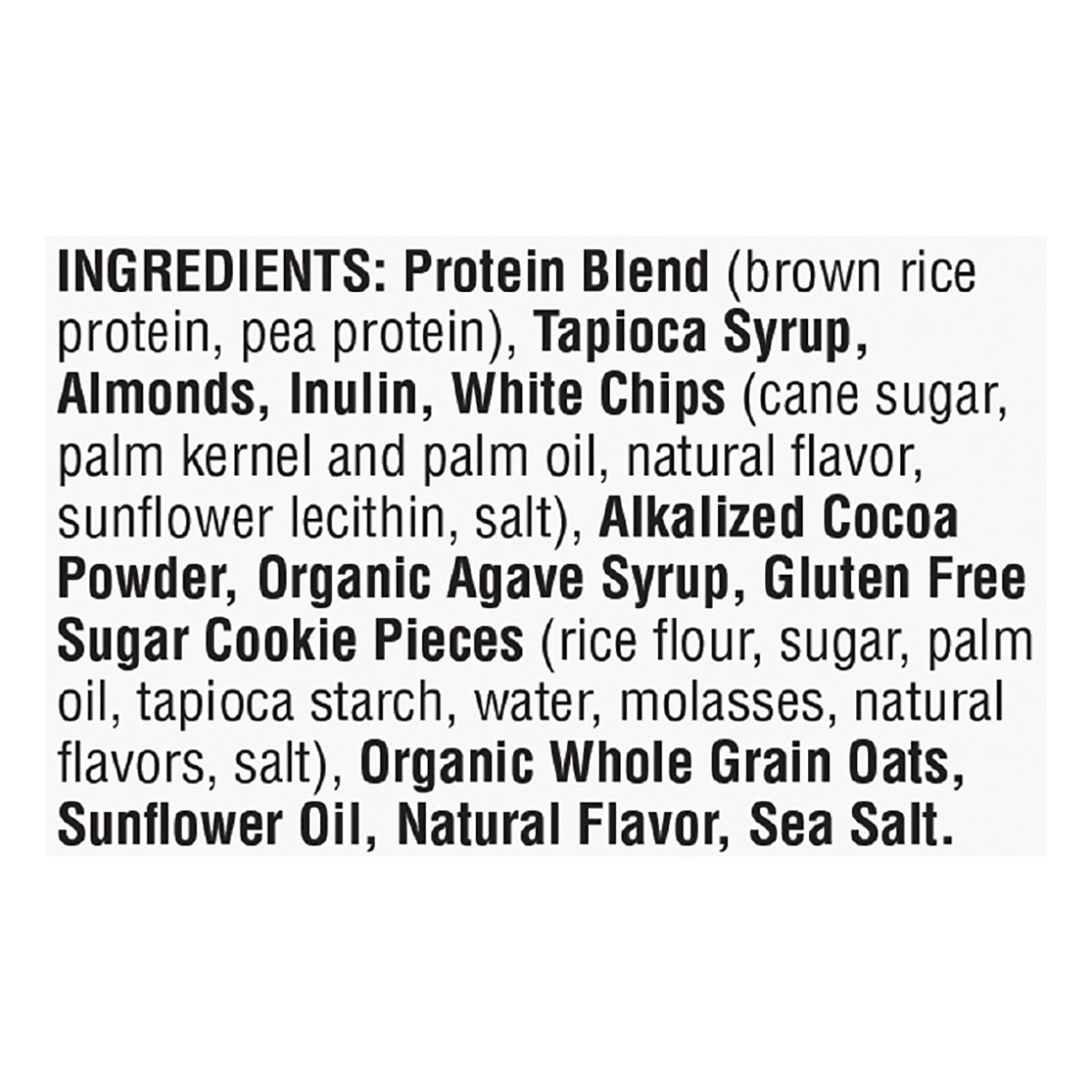 Protein Blend (Brown Rice Protein, Pea Protein), Tapioca Syrup, Almonds, Inulin, White Chips (Cane Sugar, Palm Kernel and Palm Oil, Natural Flavor, Sunflower Lecithin, Salt), Alkalized Cocoa Powder, O…