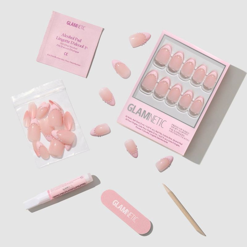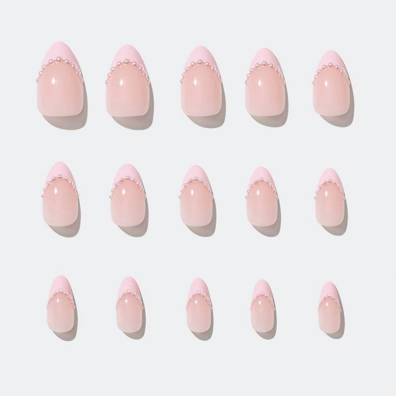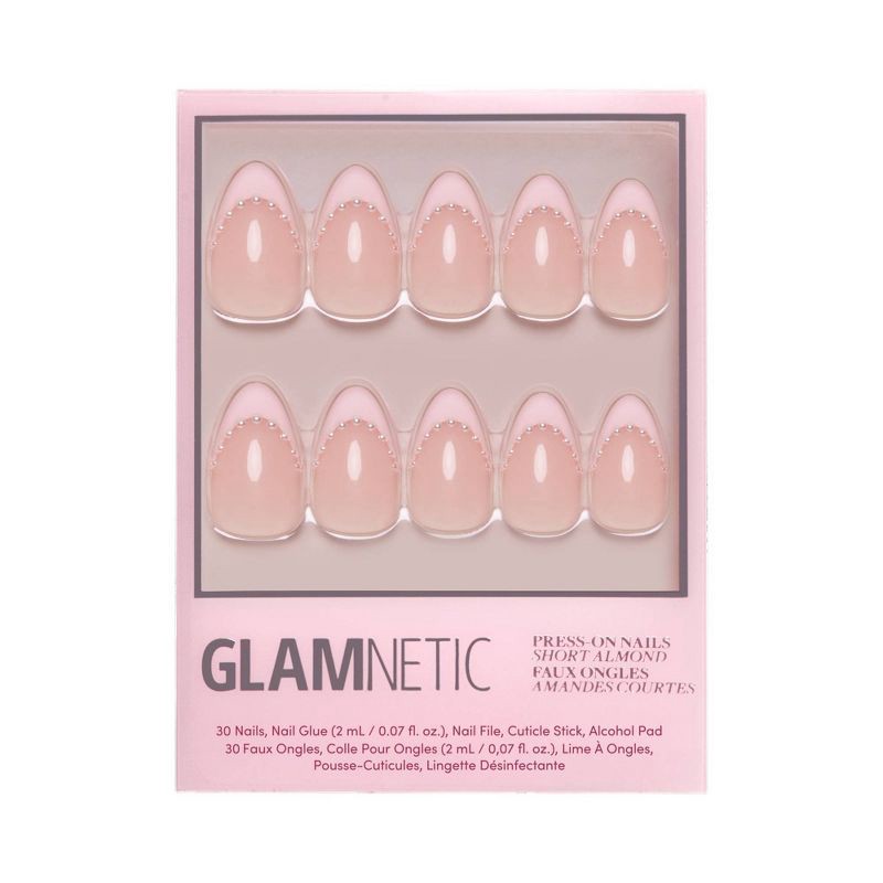Super sweet and subtly flirty, Glamnetic's Pink Me Up nail set brings soft love to life. This short almond design features a semi-transparent base, blush pink French tips, and 3D pearl trim embellishm…