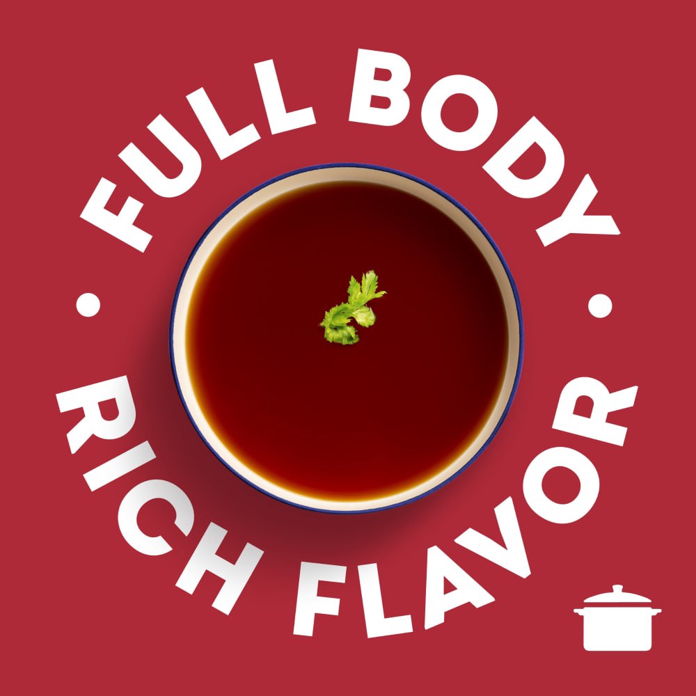 - A beef stock made with perfectly balanced flavors of roasted beef and farm-grown vegetables