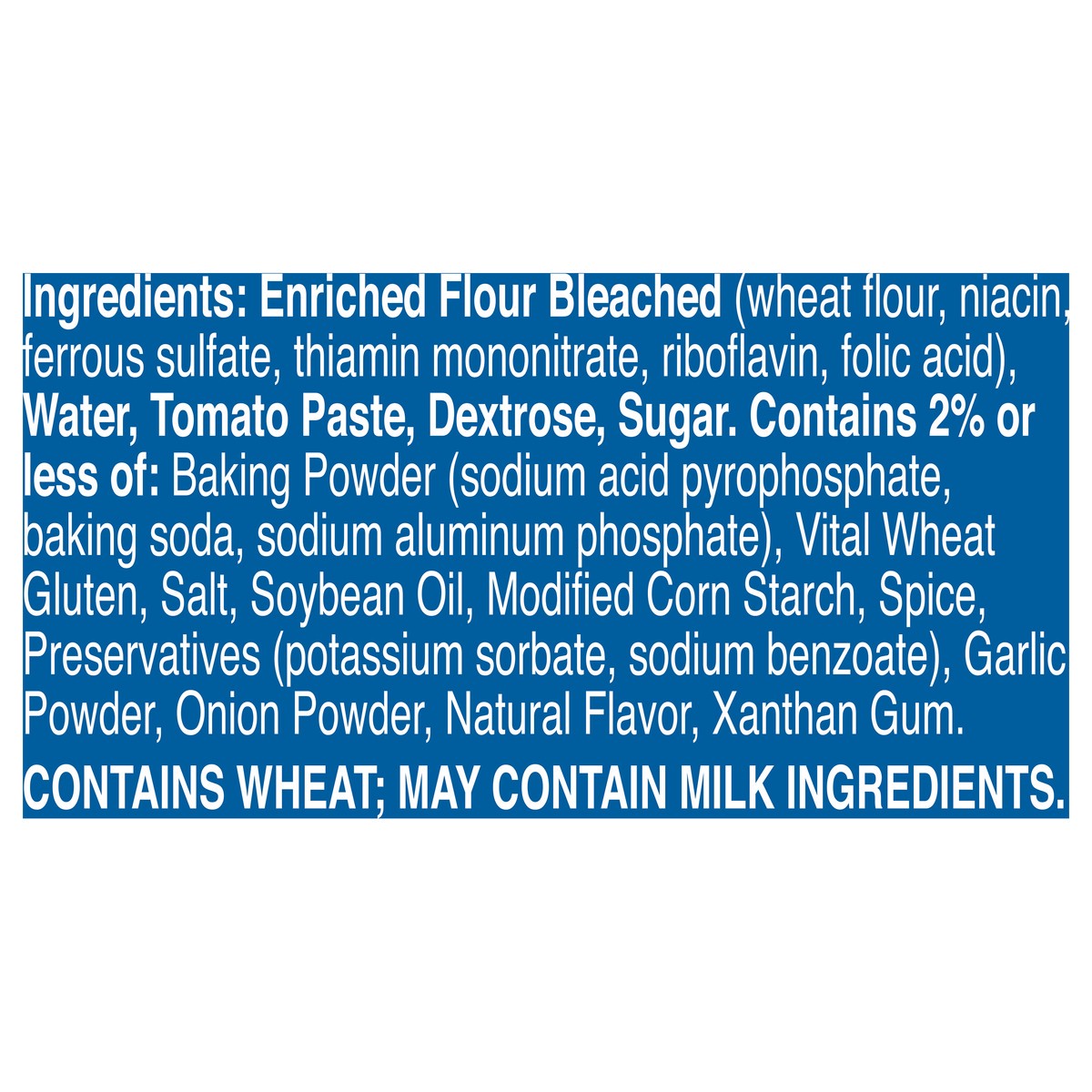 Enriched Flour Bleached (Wheat Flour, Niacin, Ferrous Sulfate, Thiamin Mononitrate, Riboflavin, Folic Acid), Water, Tomato Paste, Dextrose, Sugar, Contains 2% or Less of: Baking Powder (Sodium Acid Py…