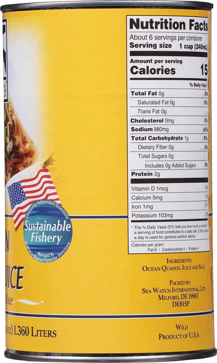 Ready-to-use. Our pure North Atlantic clam juice is cooked and filtered, ready-to-use. Add extra clam flavor and body to chowders, sauces and any sea foods recipes. Sustainable Fishery: Verified by in…