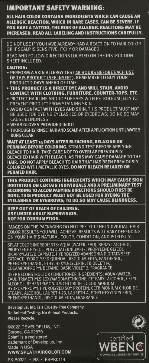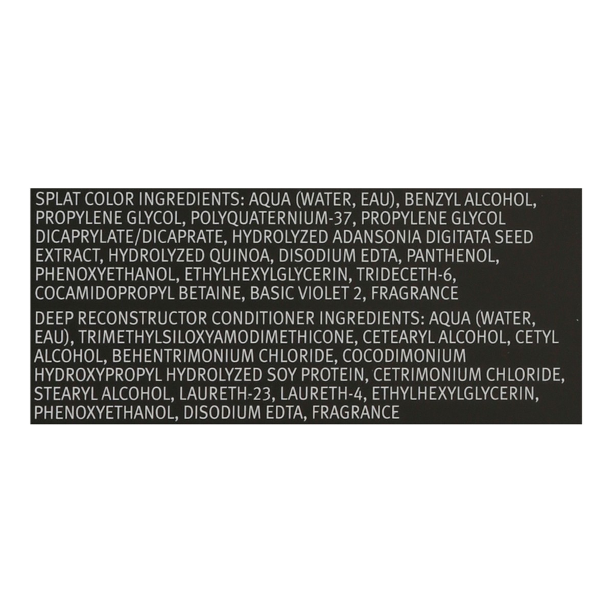 Splat Color: Aqua (Water, Eau), Benzyl Alcohol, Propylene Glycol, Polyquaternium-37, Propylene Glycol Dicaprylate/Dicaprate, Hydrolyzed Adansonia Digitata Seed Extract, Hydrolyzed Quinoa, Disodium EDT…