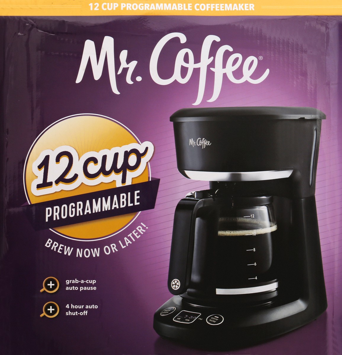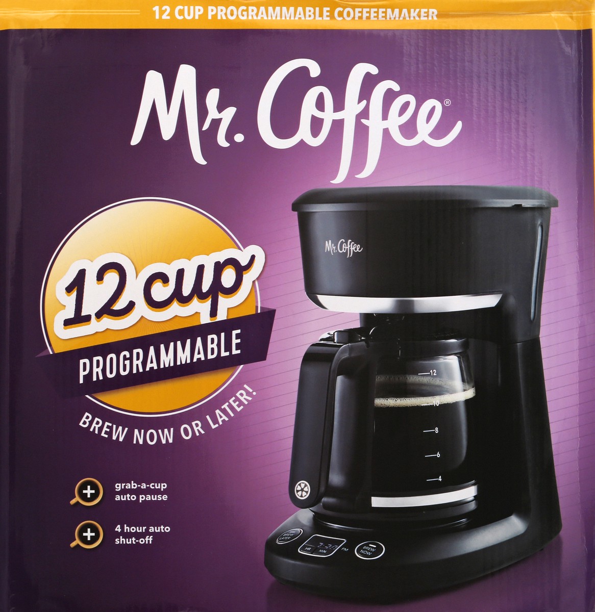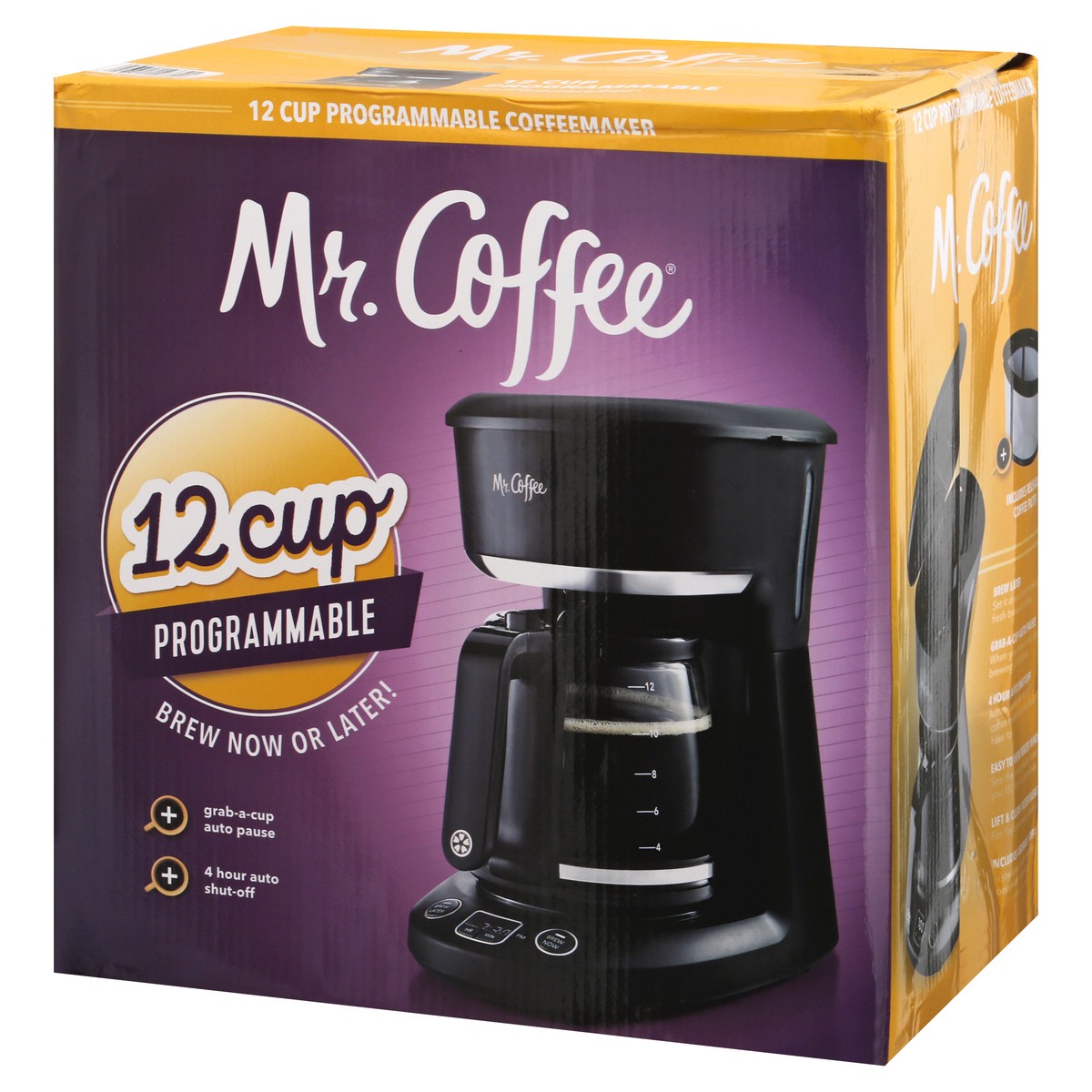 12 Cup. Brew now or later! Grab-a-cup auto pause. 4 hour auto shut-off. Includes reusable coffee filter. Brew Later: Set it ahead and wake up to fresh brewed coffee. Grab-a-cup Auto Pause: When you ne…
