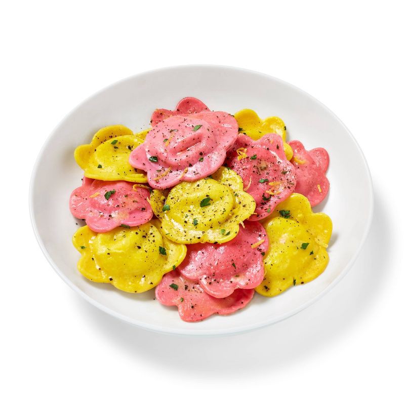 PASTA (WHEAT FLOUR, WATER, EGGS, TURMERIC [COLOR], BETA-CAROTENE [COLOR], CARMINE [COLOR]), FILLING (RICOTTA CHEESE [PASTEURIZED WHOLE MILK, VINEGAR, SALT], PARMESAN CHEESE [PASTEURIZED PART-SKIM MILK…