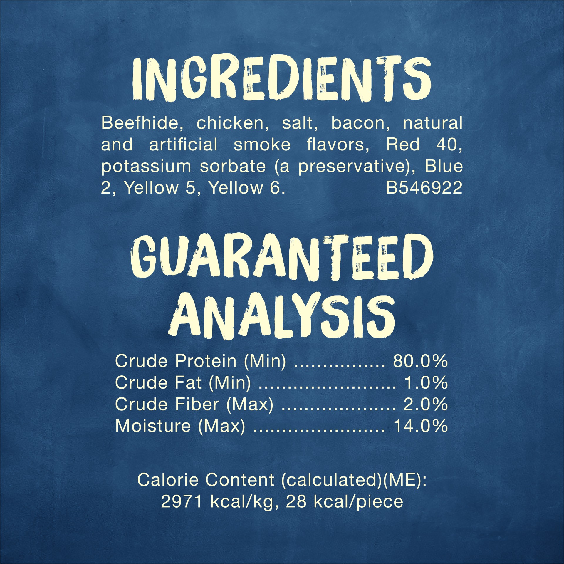 Beefhide, Chicken, Salt, Bacon, Natural And Artificial Smoke Flavors, Red 40, Potassium Sorbate (A Preservative), Blue 2, Yellow 5, Yellow 6. B546922
