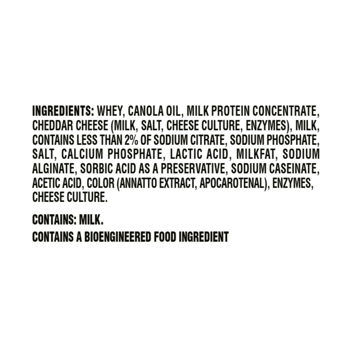 Whey, Canola Oil, Milk Protein Concentrate, Cheddar Cheese (Milk, Salt, Cheese Culture, Enzymes), Milk, Contains Less than 2% of Sodium Citrate, Sodium Phosphate, Salt, Calcium Phosphate, Lactic Acid,…