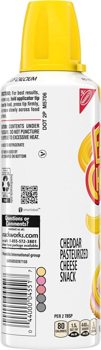 Easy Cheese Cheddar Cheese Snack has the delicious taste of cheddar cheese in a fun, spreadable form. This spray cheese is pasteurized and requires no refrigeration, making it a convenient, go anywher…