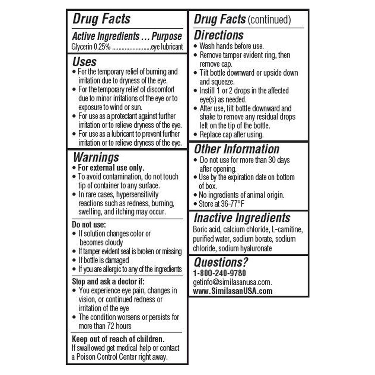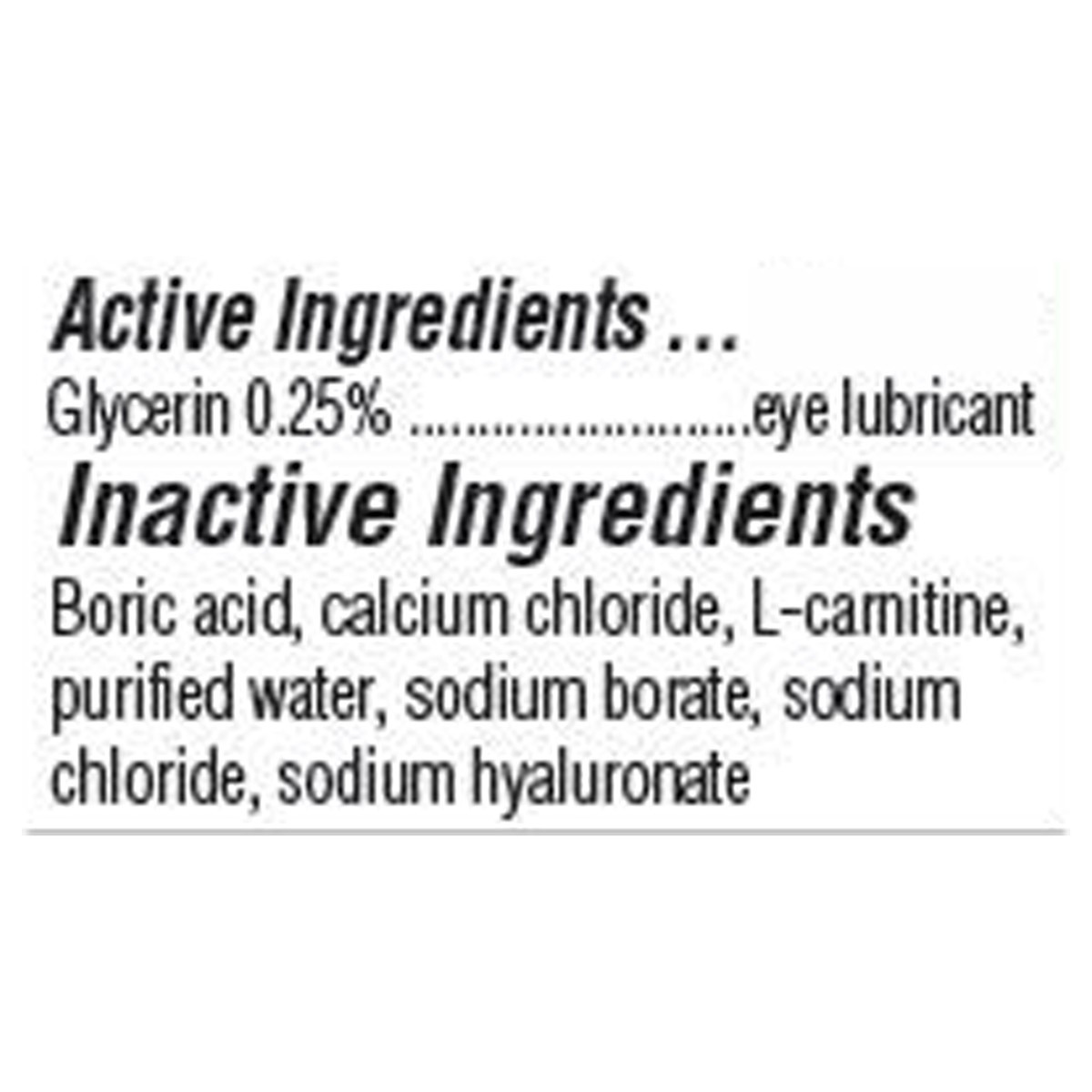 Active Ingredients: Glycerin (0.25 %), Eye Lubricant. Inactive Ingredients: Boric Acid, Calcium Chloride, L-Carnitine , Purified Water, Sodium Borate, Sodium Chloride., Sodium Hyaluronate.