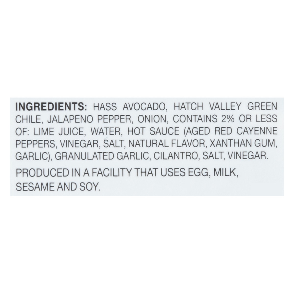 Hass Avocado, Hatch Valley Green Chile, Jalapeno Pepper, Onion, Contains 2% or Less of: Lime Juice, Water, Hot Sauce (Aged Red Cayenne Peppers, Vinegar, Salt, Natural Flavor, Xanthan Gum, Garlic), Gra…