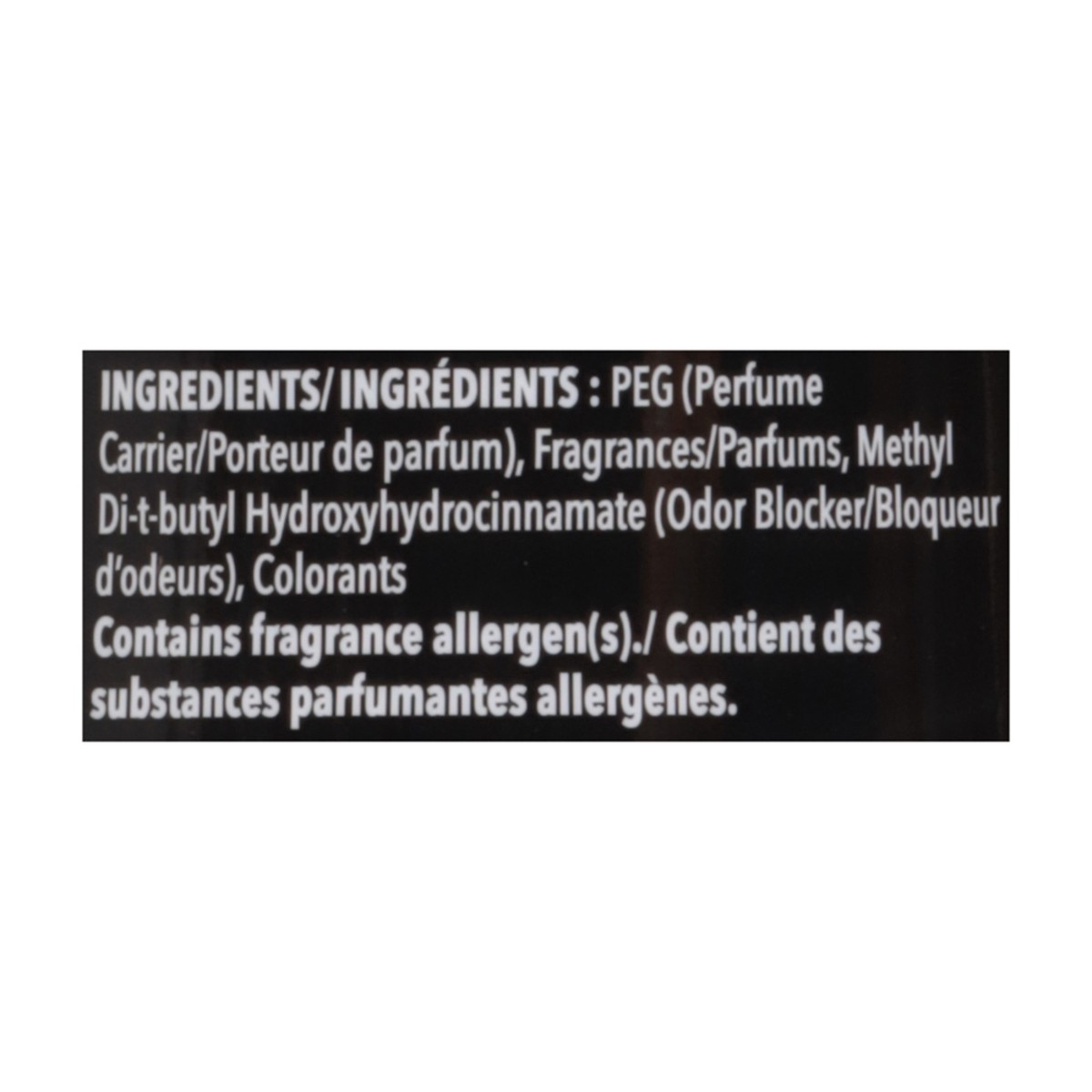 PEG (Perfume Carrier), Fragrances, Methyl Di-T-Butyl Hydroxyhydrocinnamate (Odor Blocker), Colorants.